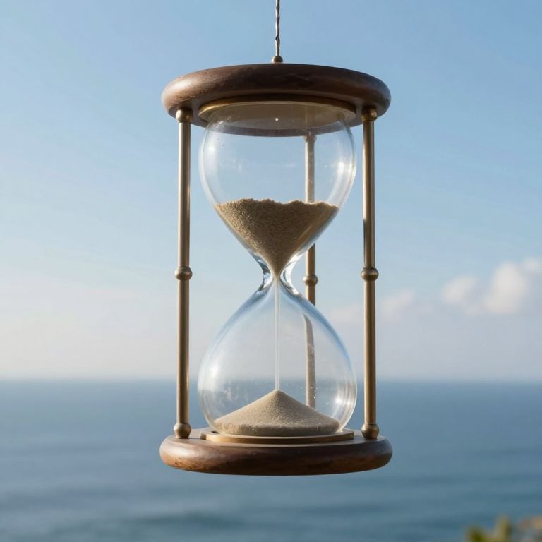 Photograph of a wooden hourglass with sand, hanging against a clear blue sky and ocean background, capturing time's passage.