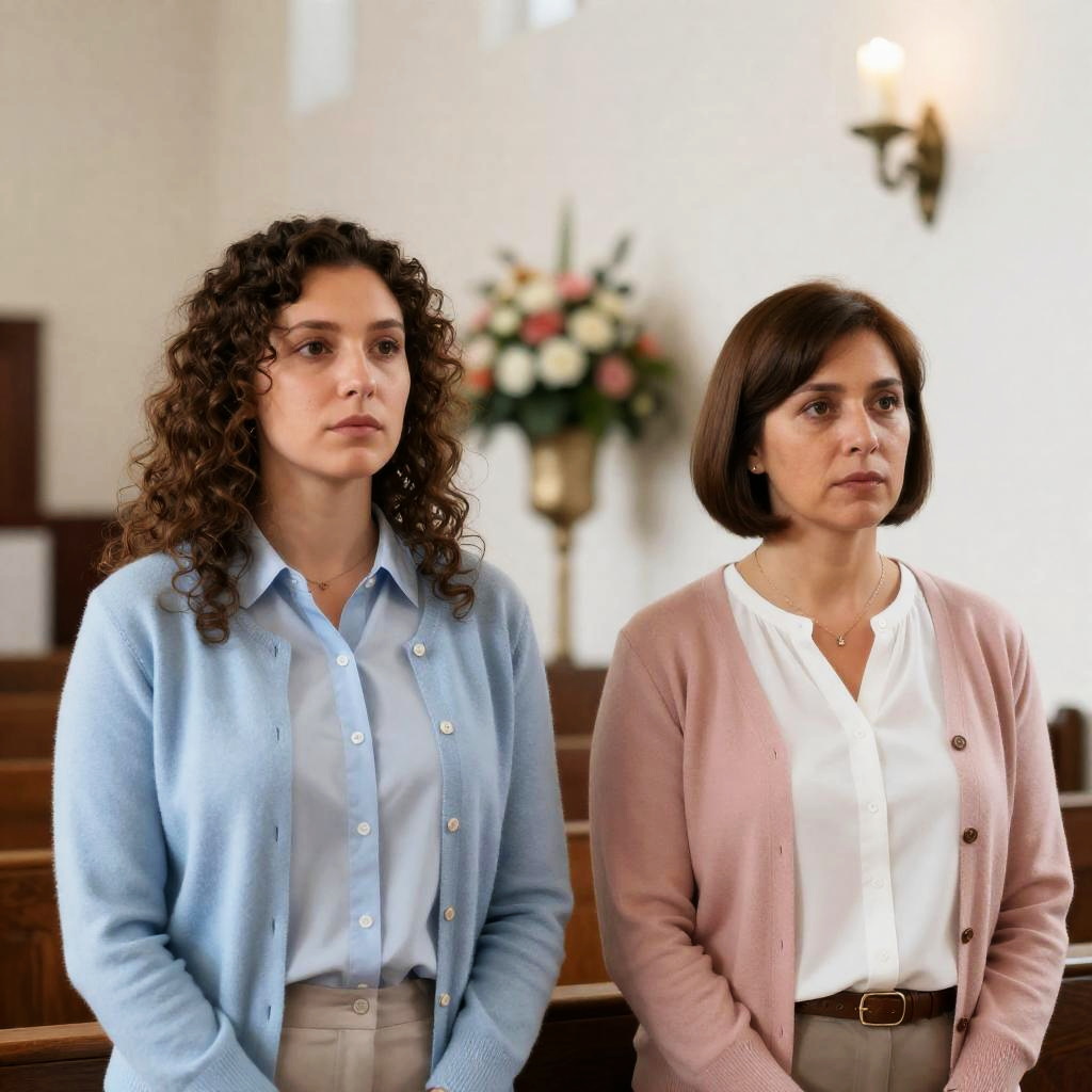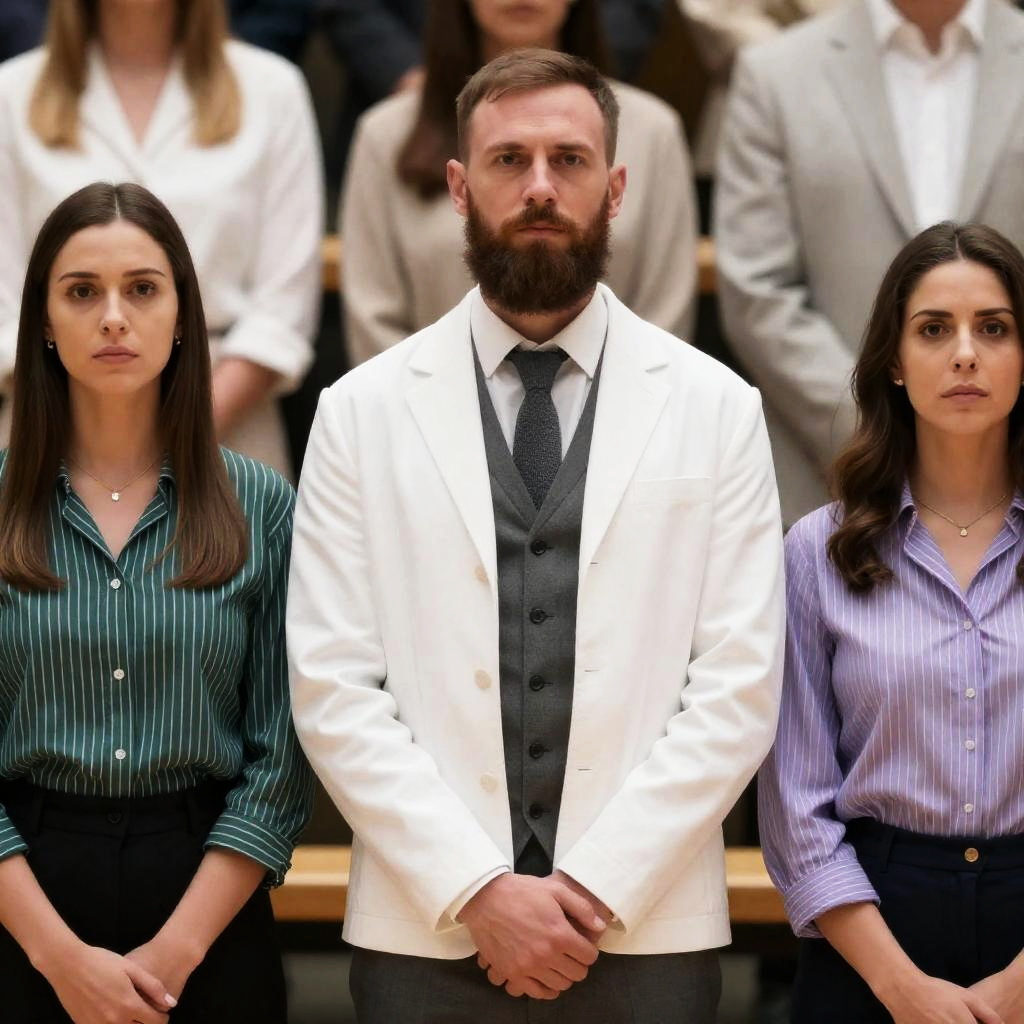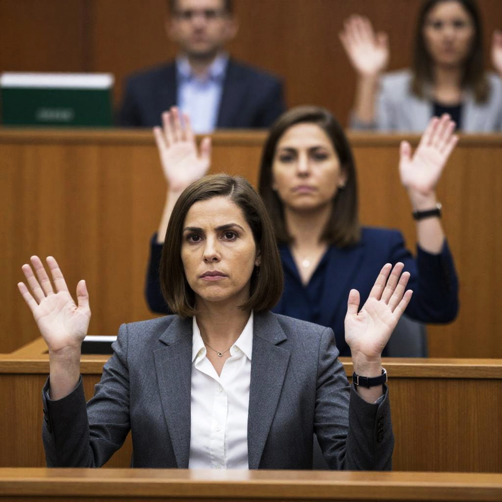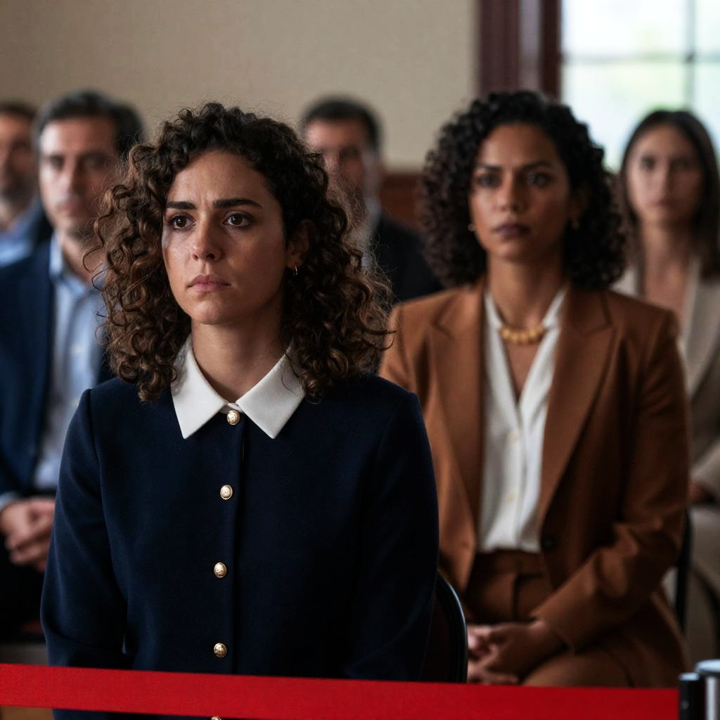 Photograph of three people in a courtroom. Foreground: woman with curly brown hair, red lipstick, tan jacket, white shirt, sunglasses on head, looking upward. Center: bearded man with dark hair, serious expression, brown jacket. Background: woman with dark hair, white scarf, blurred. Wooden walls.