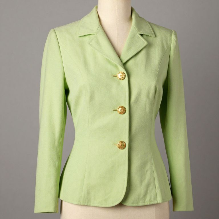 Photograph of a light green, long-sleeved, button-up blazer with gold buttons, displayed on a headless mannequin against a