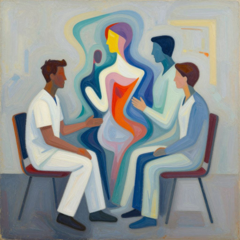 Therapists depicted in an abstract conceptual artwork symbolizing mental health care, intertwining colorful shapes and human silhouettes, fluid brushstrokes representing empathy and healing, vibrant yet soothing colors, modern impressionistic style.