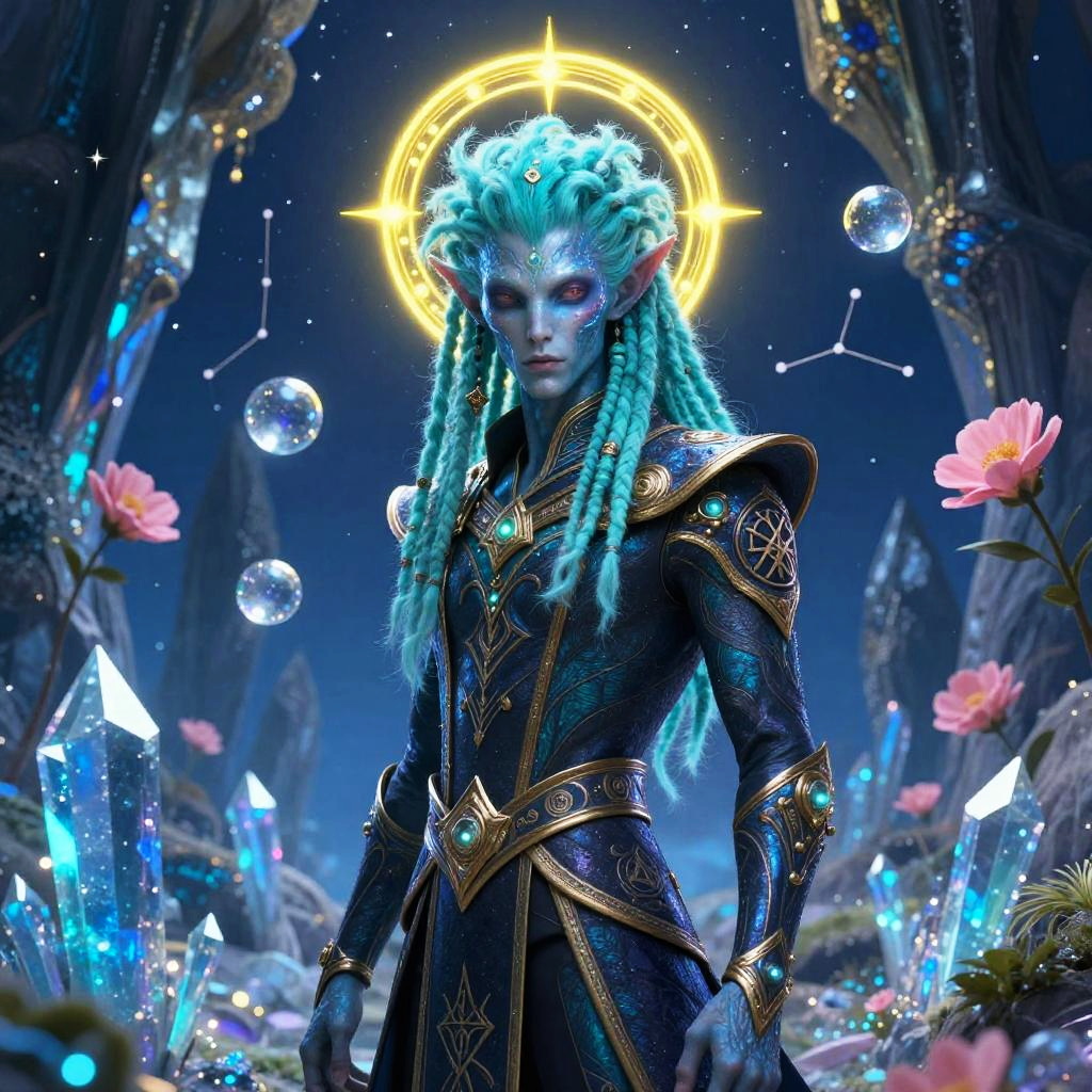 Surreal, vibrant portrait of ndar, an alien mage with aquamarine dreadlocks and iridescent silver-blue skin, set within a crystalline cavern filled with pulsating azure crystals and floating luminescent orbs. They wear an ornate dark uniform with gold accents and arcane sigils; a radiant yellow halo crowns their head as stars scatter across a cobalt sky. Pink flowers drift among constellations, luminous hues, dreamy atmosphere, surrealism with futuristic elements and glowing accents in fine intricate textures.