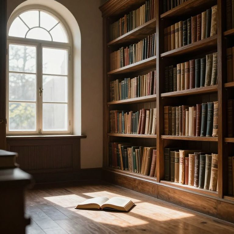 Sunlight streams through an arched window, casting ethereal shadows across a serene library filled with wooden shelves brimming with aged books, while an open tome rests on the floor, inviting quiet contemplation.