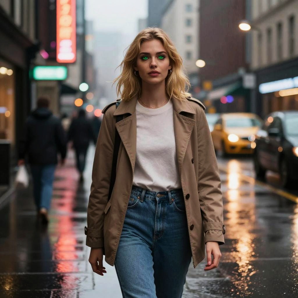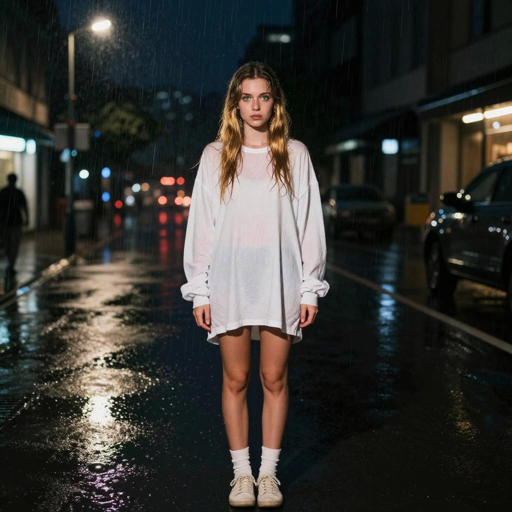 Photograph of a young woman with long, wet blonde hair, wearing a white oversized shirt, white socks, and white sneakers, standing in a rainy