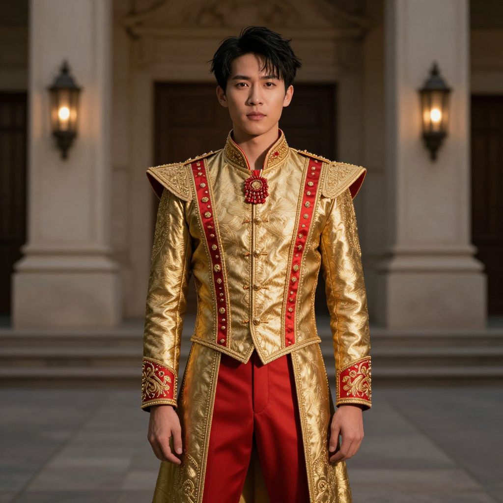 Spotlight Costume, asian man in a golden and red outfit standing in front of a building