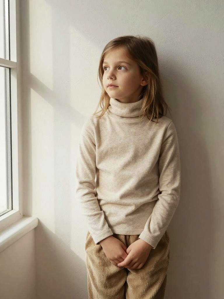 9 years old girl lifestyle photo, pale-skinned girl with dark blonde hair and curious eyes wearing soft beige turtleneck and corduroy trousers, standing relaxed with her back against a textured wall, hands loosely folded in front of her, soft natural window light from the side, cozy minimalist interior, indoor wall with hints of sunlight patterns across it
