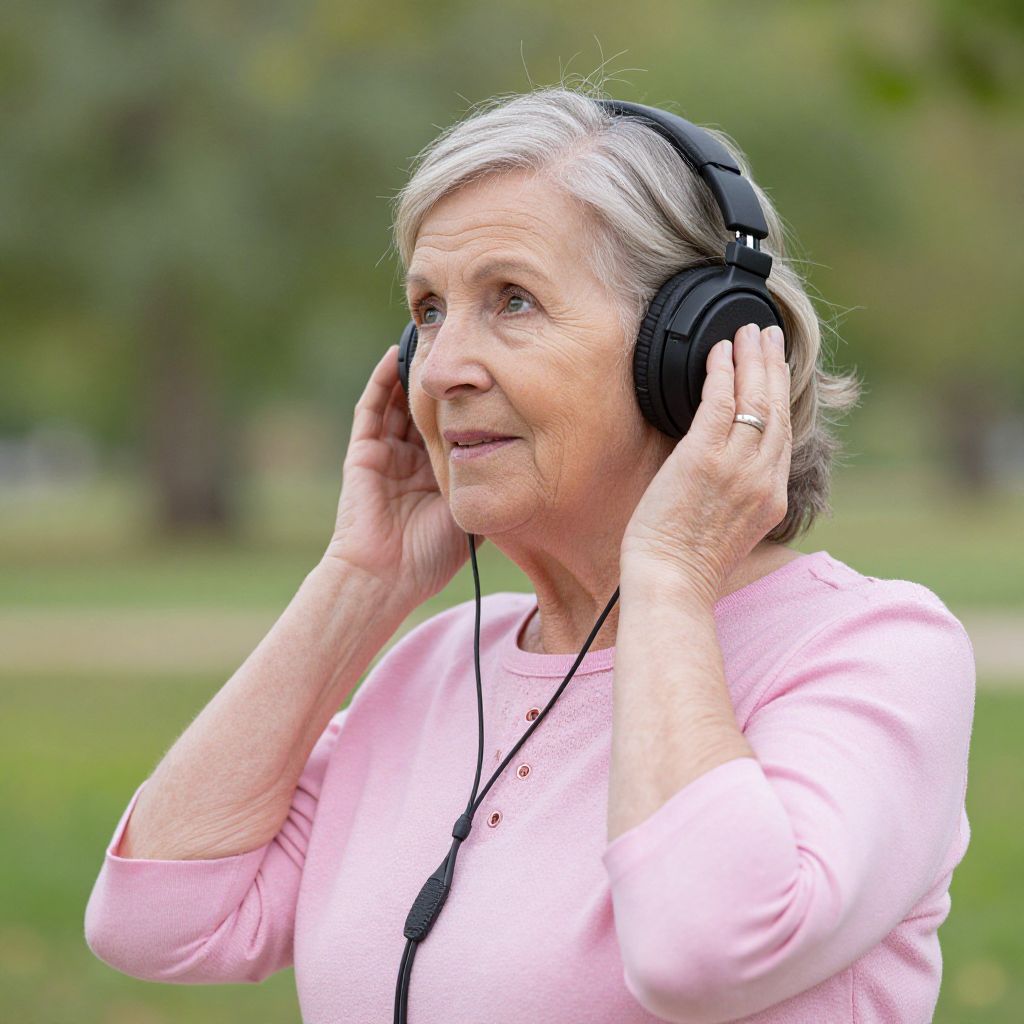 Photograph of an elderly woman with short gray hair, wearing a white sweater, listening to music with black headphones in a sunny park.