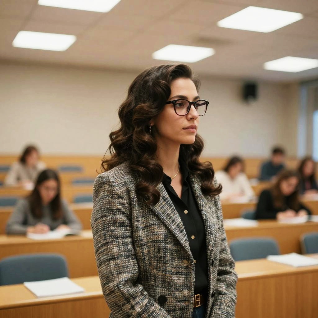 540 Waves hairstyle on female professor, wearing tweed jacket and glasses, in university lecture hall, captured in fashion editorial style with soft overhead lights.