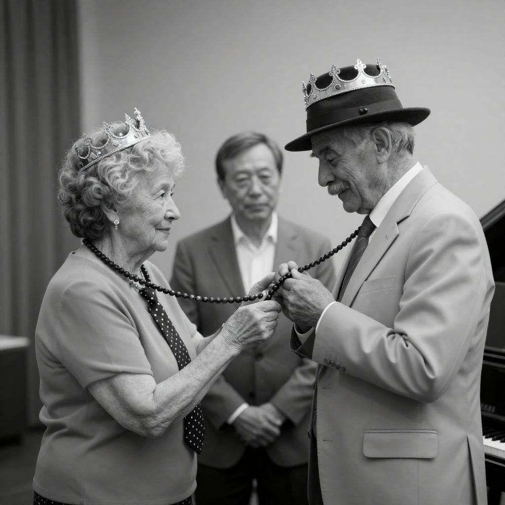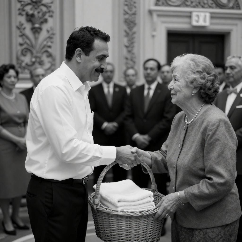 Black-and-white photograph. A man in a white shirt and black pants, holding a wicker basket, shakes hands with an elderly woman in formal attire. Background: ornate wall panels, people in formal wear, exit sign. Crowd watches attentively. Man's mustache prominent. Basket contains folded towels.