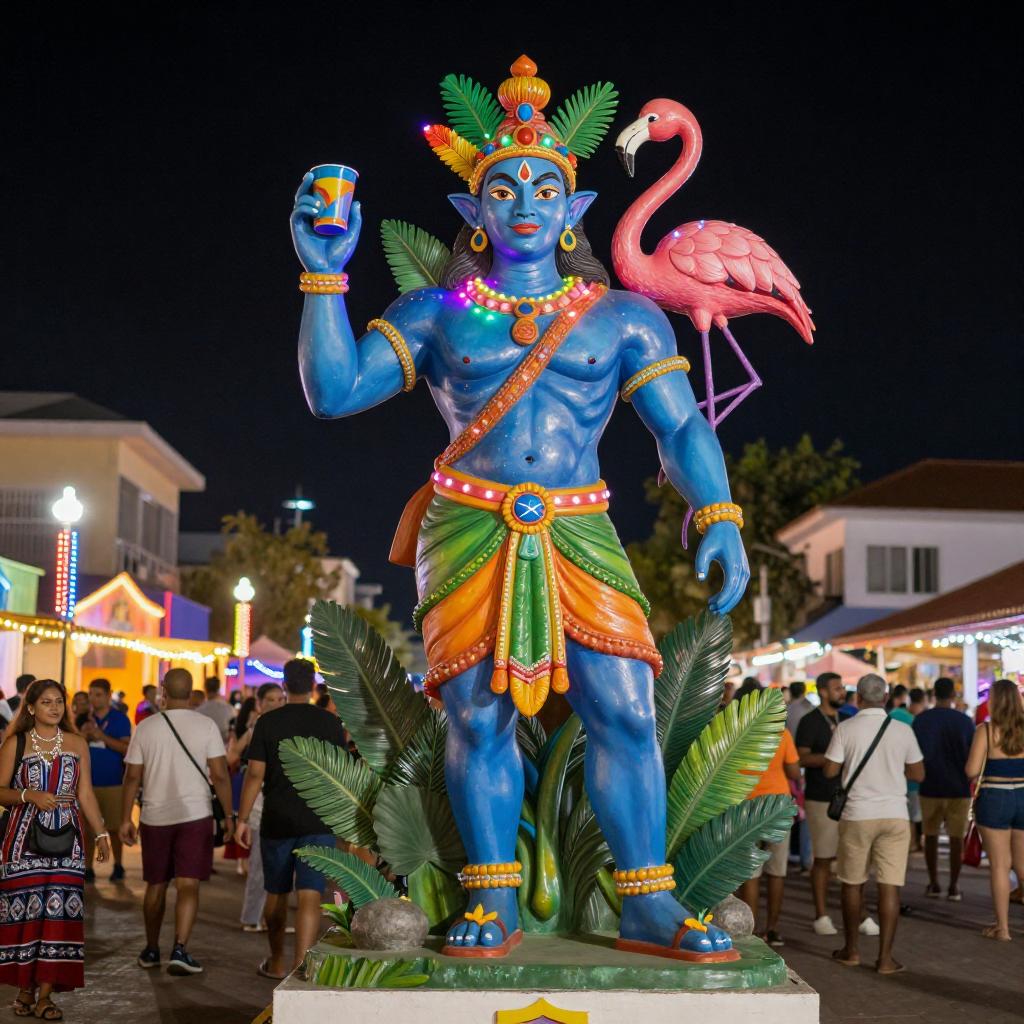 Photograph, colorful statue, blue-skinned god, tropical attire, flamingo headdress, green and orange skirt, muscular build, holding cup, multicolored lights, night scene, plaza, crowd of people, vibrant colors, neon lights, statue on pedestal, festive atmosphere, street festival, illuminated buildings, traditional costume, detailed texture, cultural event, lively environment