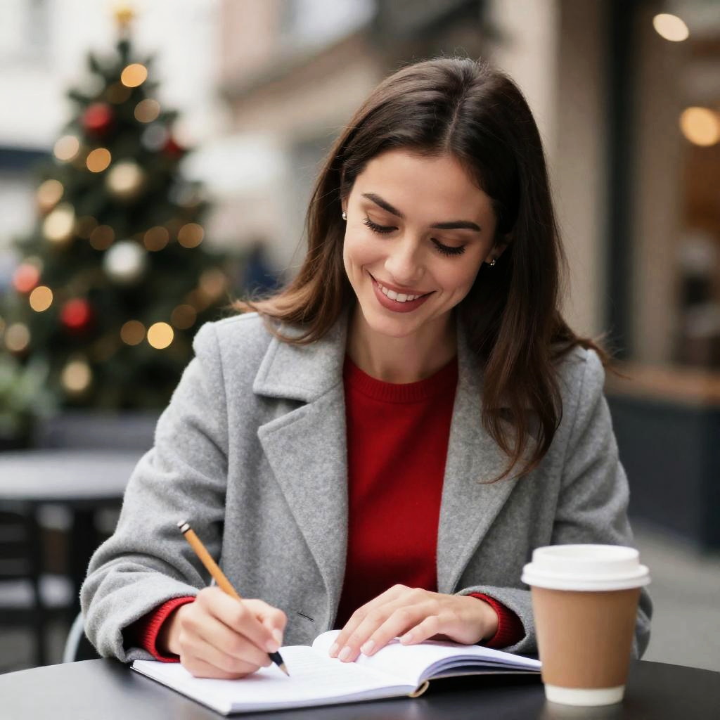 Photograph of a woman with light skin and brown hair, wearing a beige coat with black trim and a dark scarf. She has a slight smile, looking to the right. She holds a patterned cup in her gloved hand. Background features blurred Christmas trees with lights. She wears dark gloves. Table in foreground has two similar patterned cups.