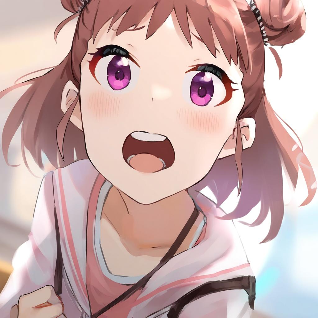 Munakata atsumi, idolmaster, 1girl, purple eyes, brown hair, short hair, double bun, by artist funi mu9, leet