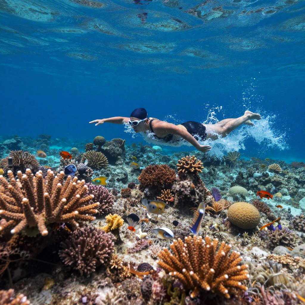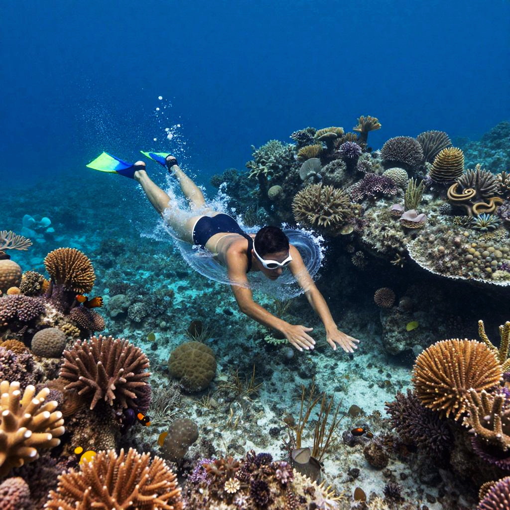 Photograph of a male snorkeler in blue fins and black swim trunks, swimming over a vibrant coral reef with diverse corals in a clear,