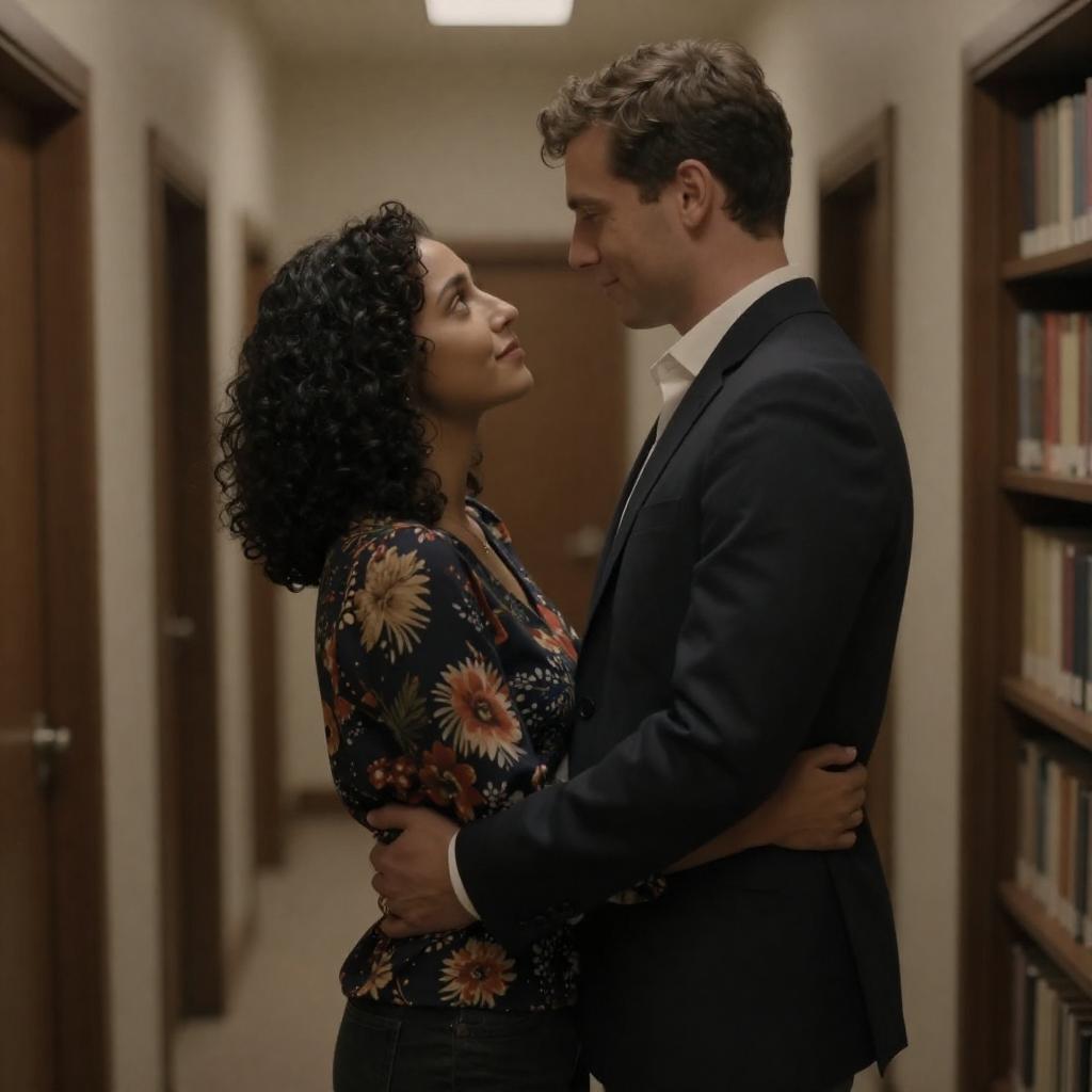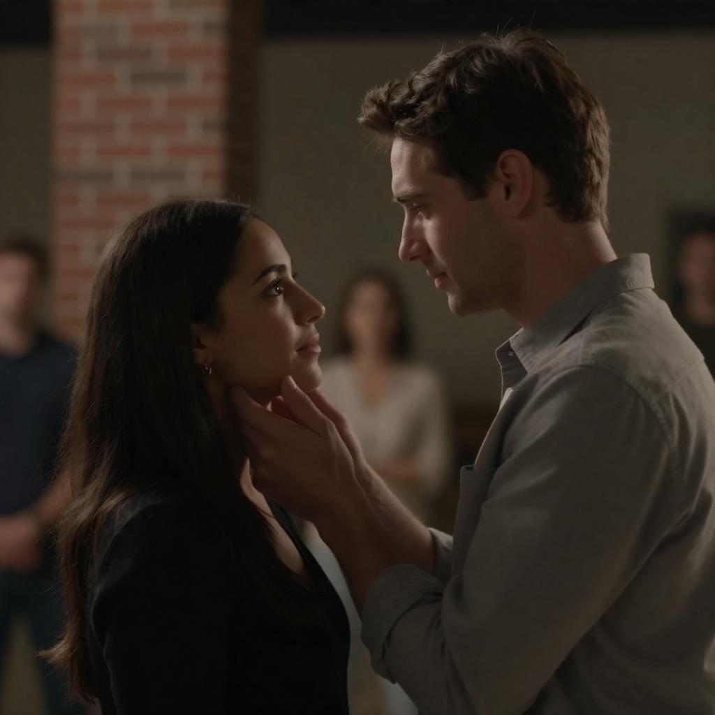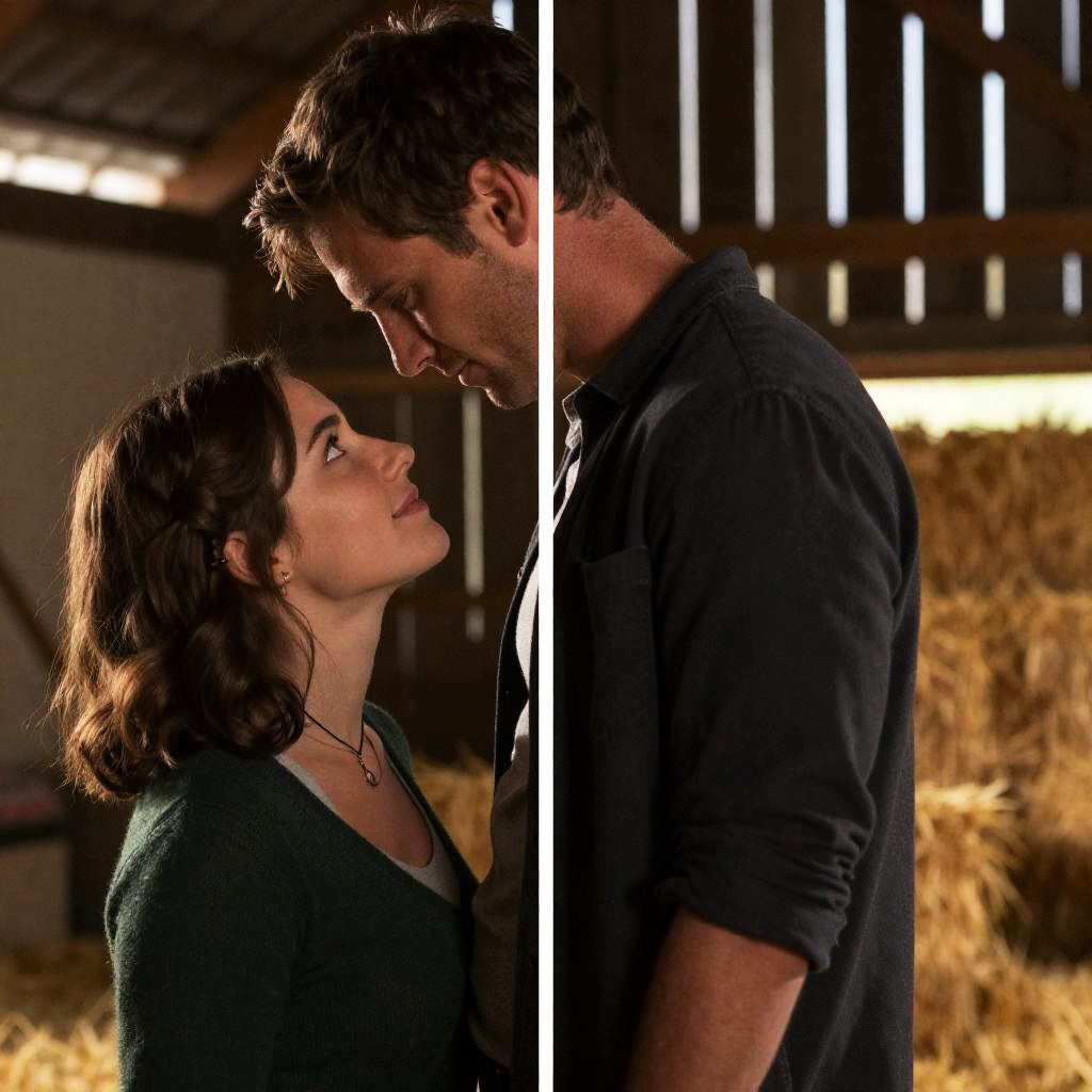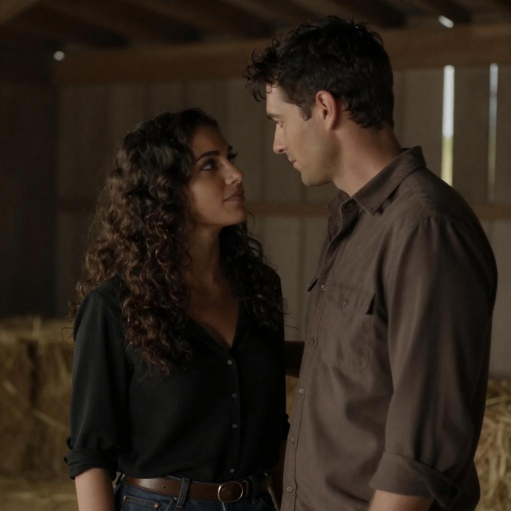 Photograph of a couple in a dimly lit barn. The woman with voluminous dark hair, wearing a black blouse, gazes at the man with short dark hair, dressed in a brown shirt. They stand close, with hay in the background, the man leaning in towards her. Warm, dramatic lighting highlights their faces.