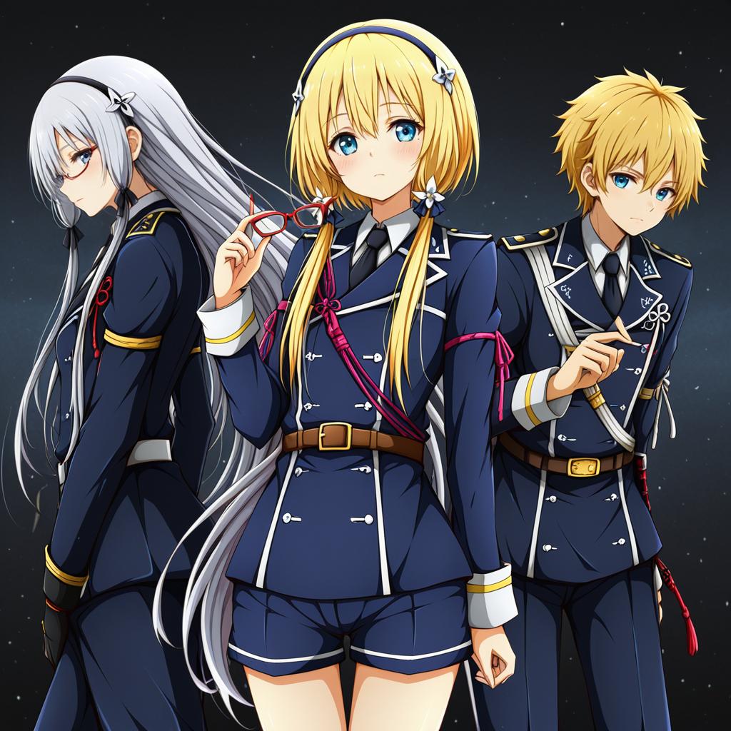 Digital illustration of two anime characters wearing detailed navy blue military-style uniforms with gold and red embellishments. Both have blonde hair; the male character wears red-framed glasses and a black necktie, and the female character has green eyes, flower-shaped hair accessories, and matching shorts. They stand inside a traditional wooden room with large windows showing greenery outside.