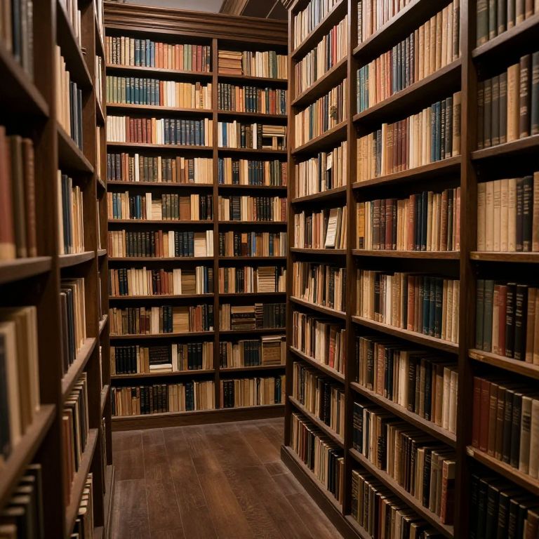 Photograph of a narrow, dimly lit library aisle with tall, dark wooden bookshelves on both sides. The shelves are filled with numerous books of varying sizes, colors, and bindings, creating a rich, textured pattern. The floor is made of polished, dark wood, adding to the warm, scholarly atmosphere. The perspective looks down the aisle, with the shelves converging in the background, emphasizing depth and the infinite nature of the library collection. The lighting is soft, casting gentle shadows that enhance the depth and texture of the scene.