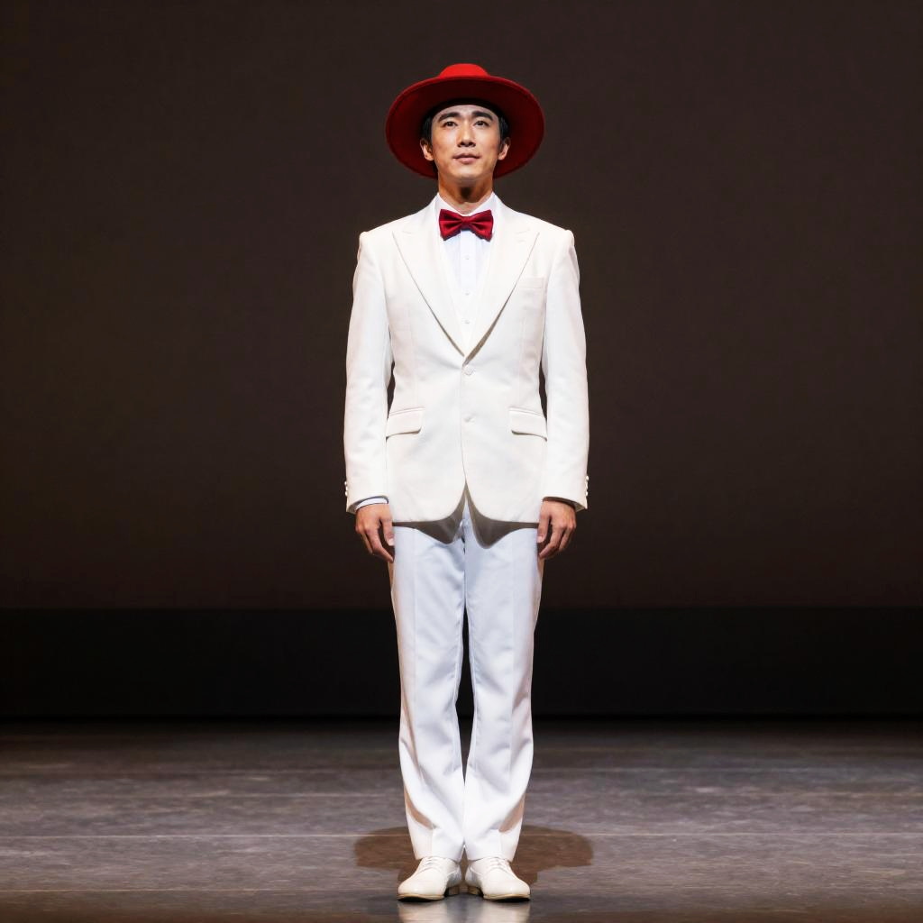 Musical Theater Costume, man in a white suit and red hat standing in a hall