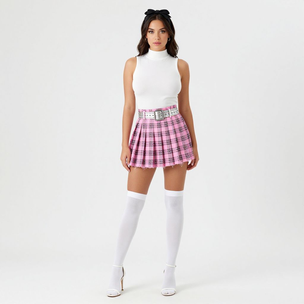 "Woman, modern preppy, white sleeveless mock turtleneck top, pink plaid mini skirt with frayed hem, silver buckled belt with glitter detailing, white thigh-high socks, white open-toe high heel sandals, black headband with a bow, white background.. Sexy. Pretty face and beаutiful eyes. Big breasts."