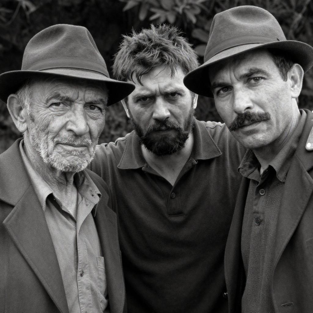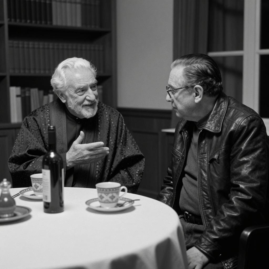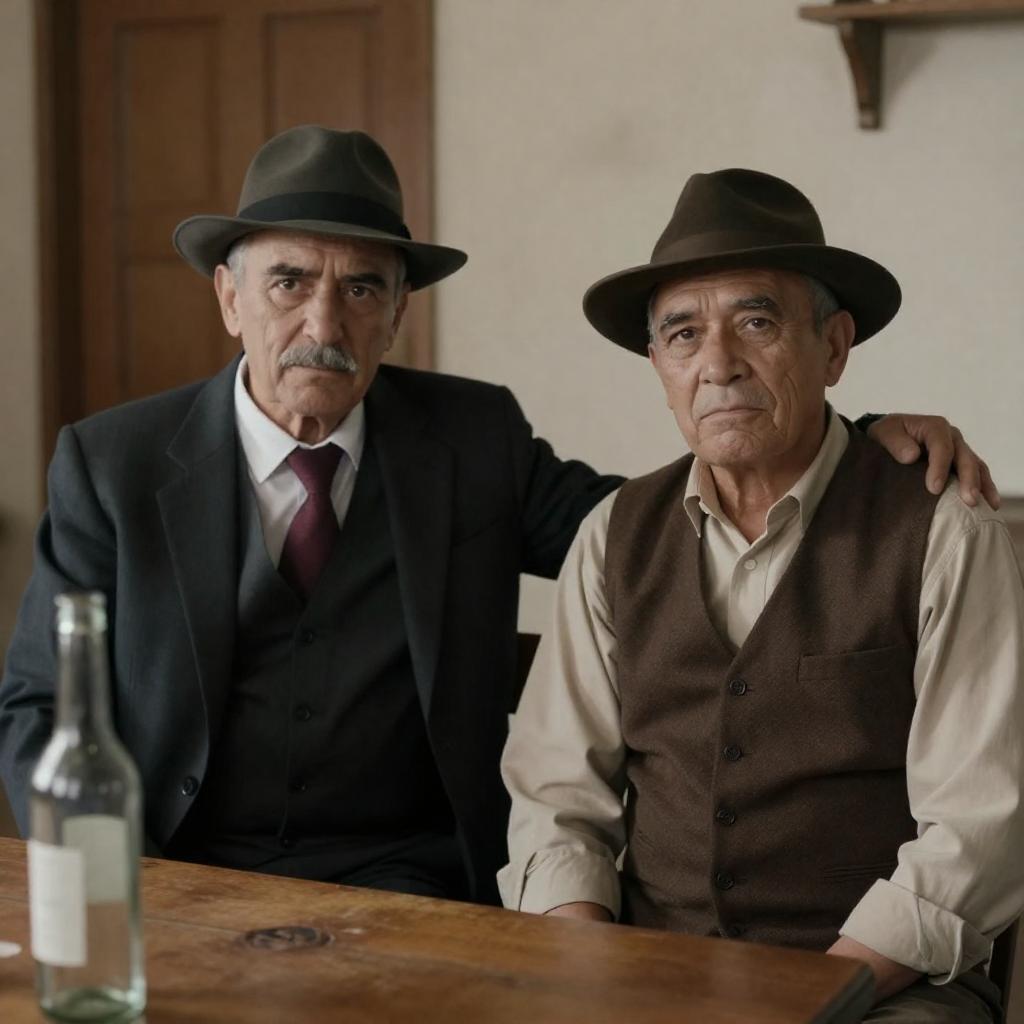 Three older men at a round metal table in a dimly lit, worn room. Two lean over the table, one with arms crossed. Glass and bottle on table. Background has ured walls and window. Intense expressions. Sepia tone.