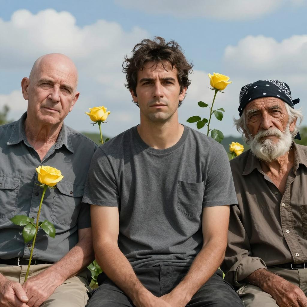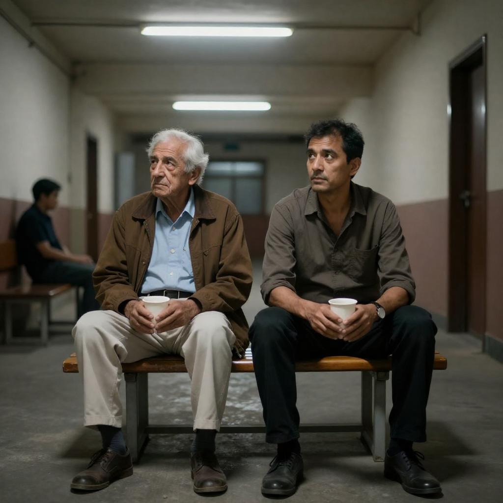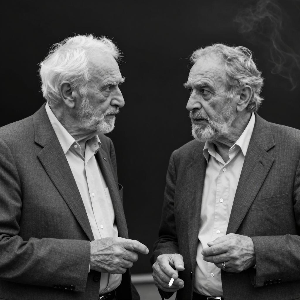 Three older men at a round metal table in a dimly lit, worn room. Two lean over the table, one with arms crossed. Glass and bottle on table. Background has ured walls and window. Intense expressions. Sepia tone.