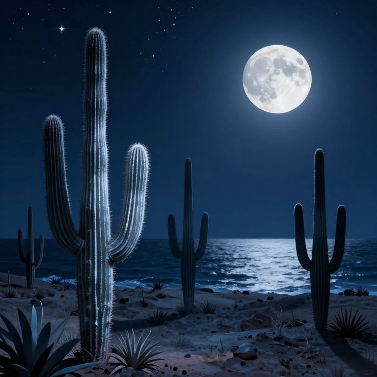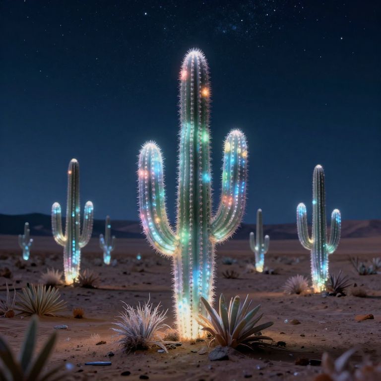 In a serene desert landscape under a starry night sky, crystalline cacti emit a soft, ethereal glow, creating a magical ambiance that harmonizes with the natural surroundings in this high-definition, computer-generated artwork.