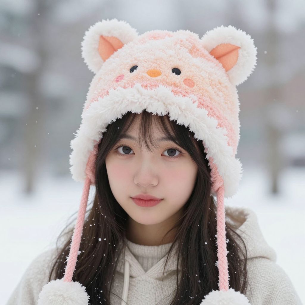 Photograph of an Asian girl with long black hair, wearing a fluffy white and pink bear-themed winter hat, and a white zip-up coat, standing