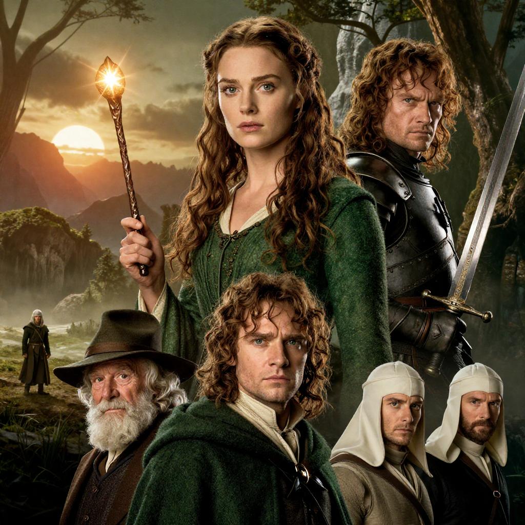 Photograph of four characters in a field with green columns in the background. A lion-man in brown fur, a smiling woman in a blue dress holding a black cat, an older man in green with a hat, and a silver knight. Lion-man stands left, woman center, man right, knight far right. Woman and older man have arms around each other. Bright sunlight in the background.