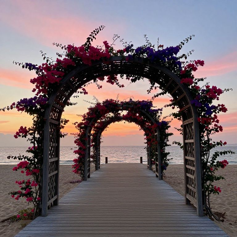 The image captures a romantic beach setting during the golden hour, with a sky painted in hues of pinks, oranges, and light blues. A series of arches, adorned with vibrant Bougainvillea flowers in shades of pink and purple, arch gracefully over a wooden boardwalk. The arches, with their intricate lattice work, create a sense of depth and perspective, leading the viewer's eye towards the distant horizon. The boardwalk, constructed from weathered wooden planks, stretches out into the sea, inviting one to walk towards the sunset. The interplay of colors, textures, and shapes creates a harmonious composition, where the natural beauty of the flowers contrasts with the man-made structure, and the warm tones of the sky complement the cool blues of the sea. The overall scene is serene and picturesque, evoking a sense of tranquility and beauty.