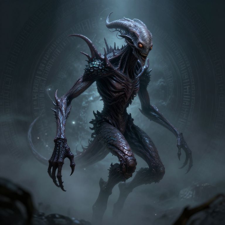 Eldritch humanoid creature depicted in a detailed fantasy style, featuring elongated limbs, a distorted humanoid face with extra eyes and mouths, covered in dark iridescent scales, hovering in a swirling mist of dark energy and cryptic glyphs.