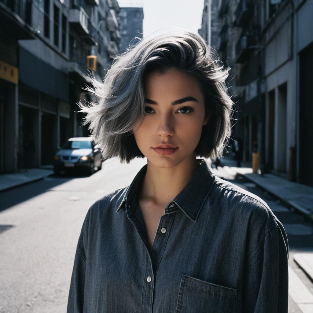 Ash Gray hairstyle on woman, wearing minimal outfit, in industrial loft, captured in fashion editorial style with neutral tone.