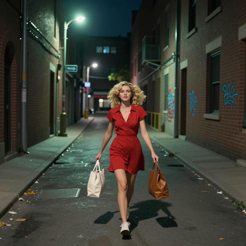 Blonde woman with curly hair runs down a dark, urban alley at night. She wears a red dress, holding a white bag in her right hand and a brown bag in her left. The alley is lined with brick buildings, litter, and green streetlights. She is in the center, moving towards the background. The alley has a steep incline, with distant buildings illuminated in green. Street signs and graffiti are visible on the right.
