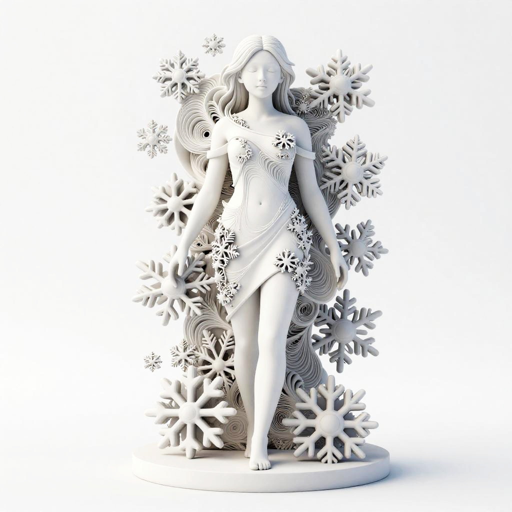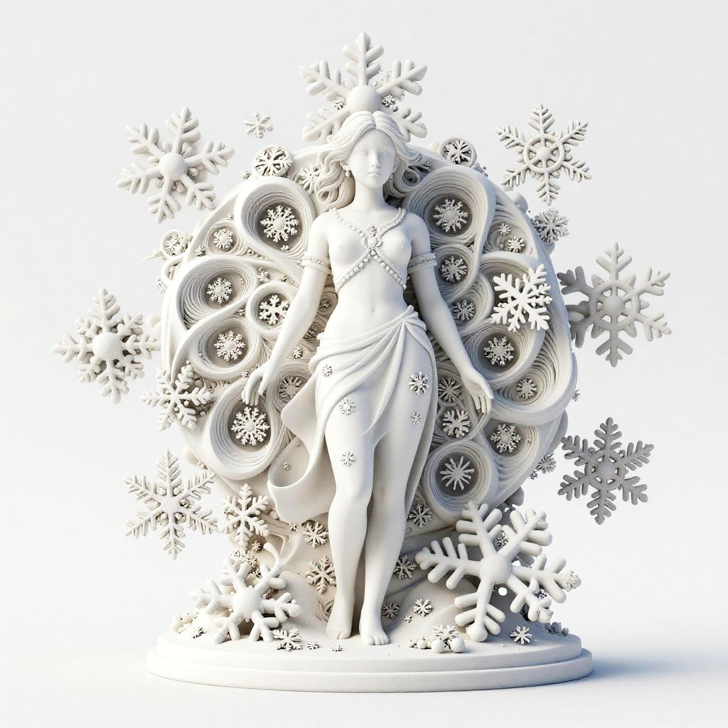 A beautiful white female 3D sculpture against a white background, whimsical snowflakes fused throughout the sculpture, style of hyperrealism by Yayoi Kusama, very intricate details, abstract vector fractal, wave function, zentangle, 3D shading