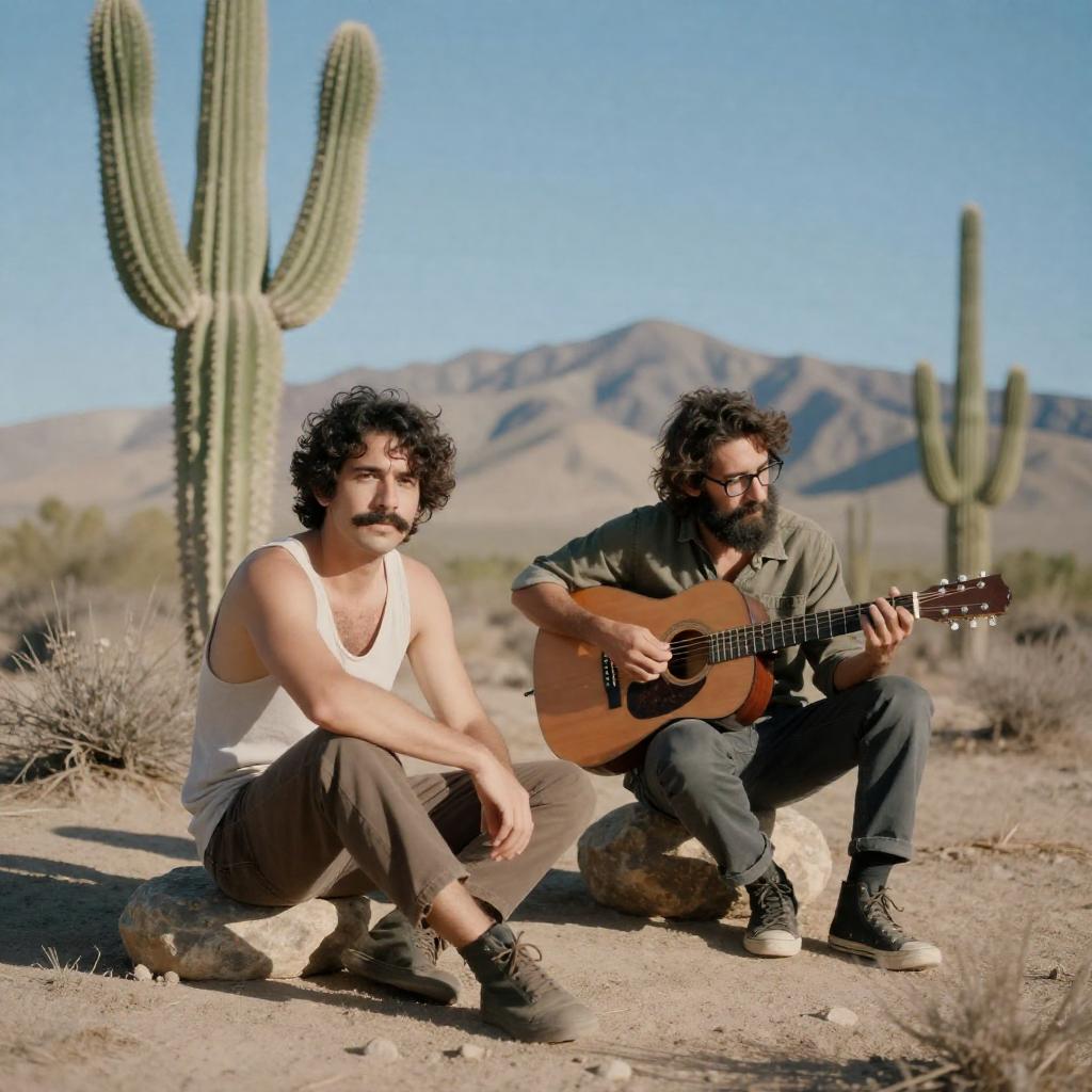 Two men in a desert with cacti and mountains. One with a mustache, wearing a tank top, sits on the ground. The other, with a beard and glasses, plays a guitar. Sunlight casts shadows. Desert vegetation in the background.