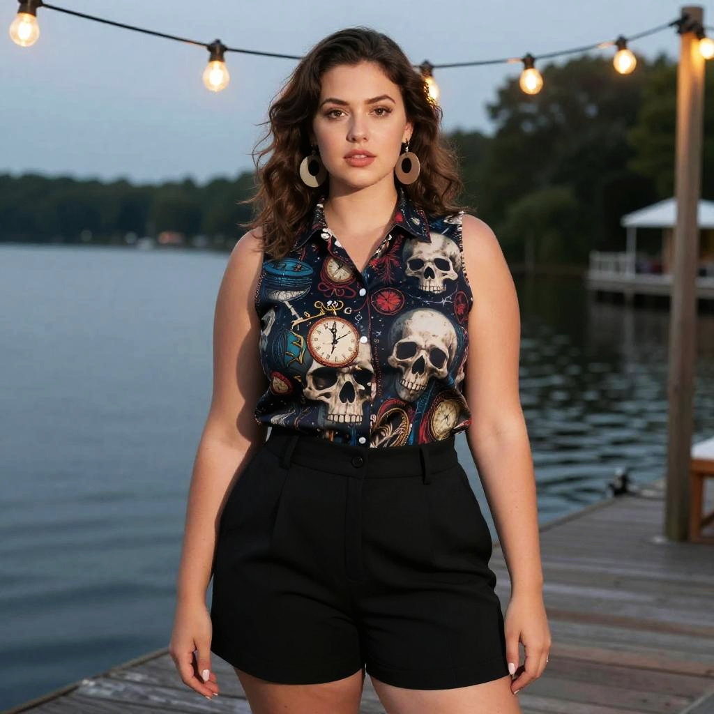 A lanky woman in a drawn and quarterly style, wearing a sleeveless collared shirt with dark macabre prints of skulls and timepieces, paired with tailored black shorts and large round earrings, standing under string lights at a lakeside dock. Sexy. Pretty face and beutiful eyes