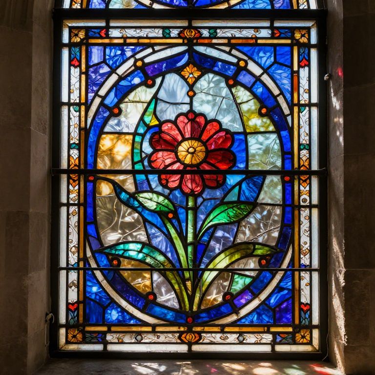 Stained glass art template featuring intricate floral patterns with vibrant colors, sunlight streaming through the glass, casting colorful reflections on a stone wall, detailed lead framing, a blend of medieval and modern styles, high resolution.