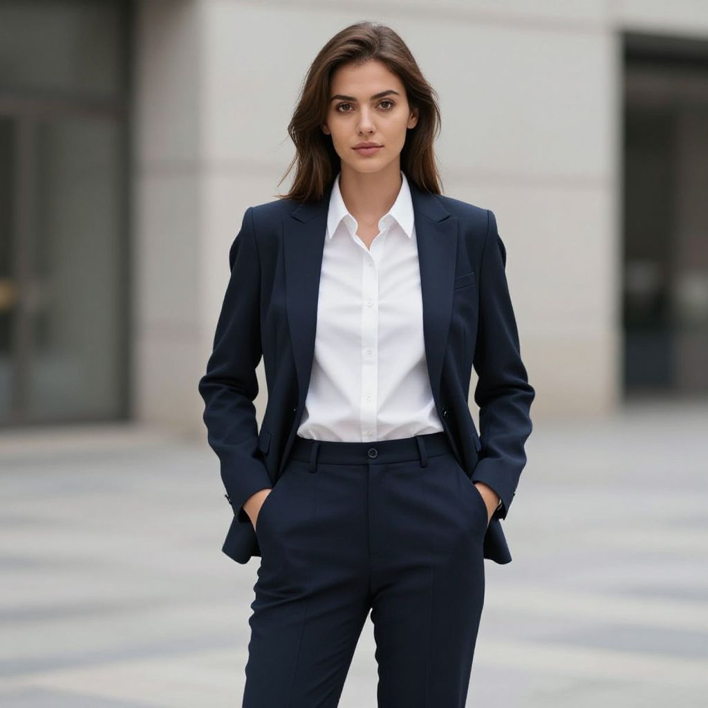 Photograph of a young woman with long brown hair, standing confidently in an urban setting. She wears a fitted black blazer over a crisp white button-up shirt, paired with black trousers. Her hands are casually in her pockets. The background is blurred, featuring a modern building with large windows and light-colored walls. The woman's expression is neutral, and she gazes directly at the camera. The overall style is professional and contemporary, emphasizing a sleek and polished look. The lighting is natural, highlighting her features and attire.