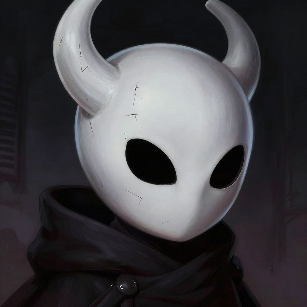 Close-up of the Hollow Knight protagonist's mask with cracks and scratches, set against a dark, ominous background, highly detailed digital painting, dramatic shadows