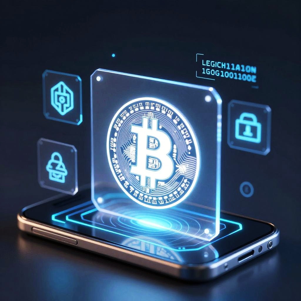 Digital artwork of a glowing, holographic Bitcoin icon over a futuristic smartphone, surrounded by neon blue lock and warning icons.