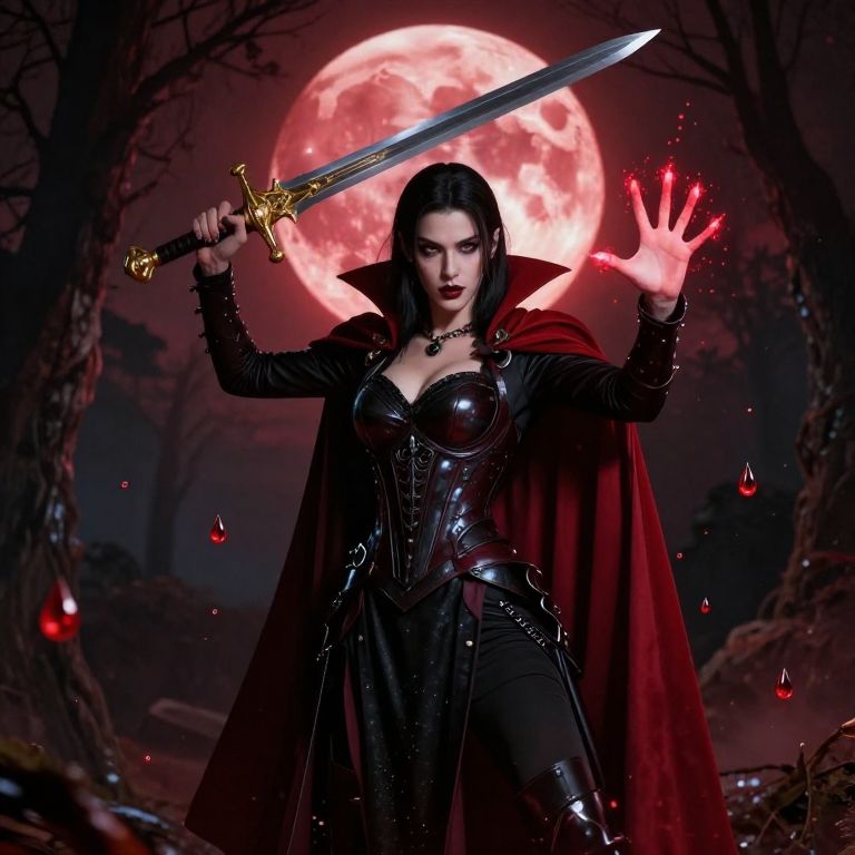 Vampire warrior poised dramatically against a crimson moonlit sky, wielding a golden-hilted sword in her right hand while casting a spell with her left, surrounded by floating blood droplets and a dark forest backdrop.