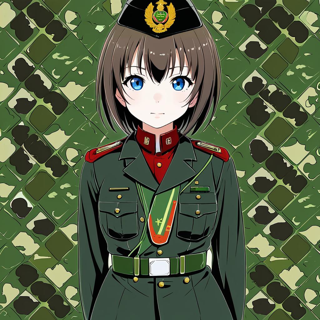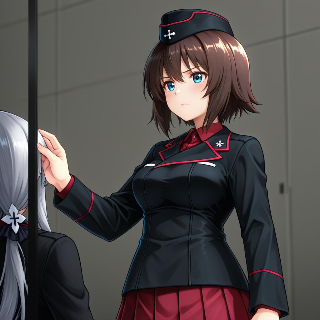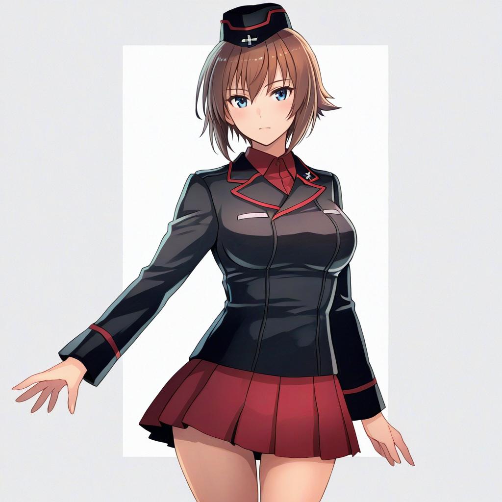 Hida ema, girls und panzer, 1girl, blue eyes, short hair, brown hair, medium breasts, kuromorimine military uniform, military uniform, kuromorimine military uniform, black jacket, dress shirt, garrison cap, red shirt, military uniform, pleated skirt, long sleeves, wing collar, insignia, by artist nakahira guy, anime