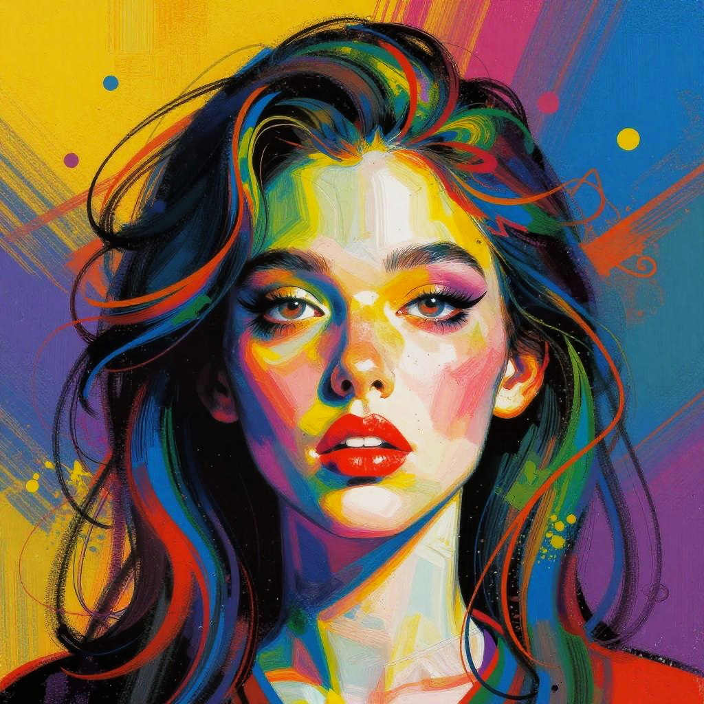 Digital pop art portrait of a young woman with vibrant, multicolored hair and makeup against a radiant yellow and blue background.