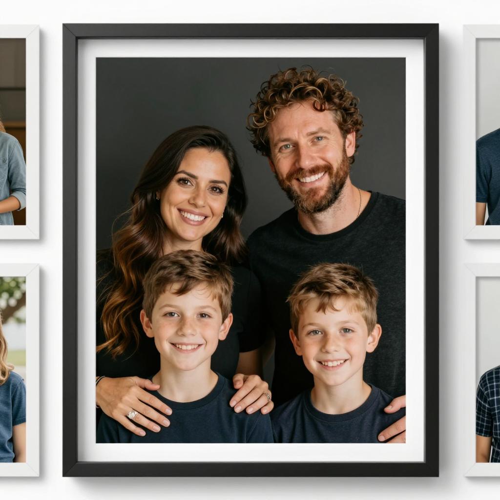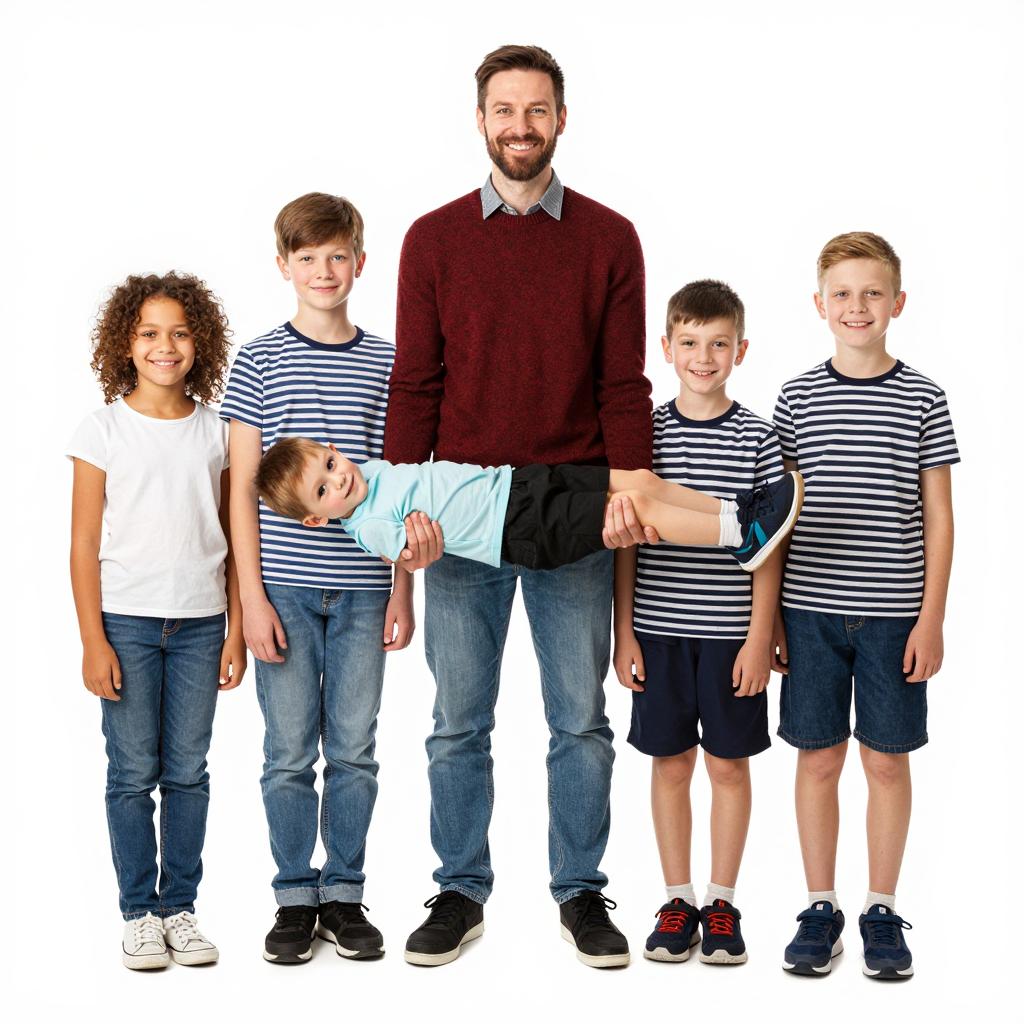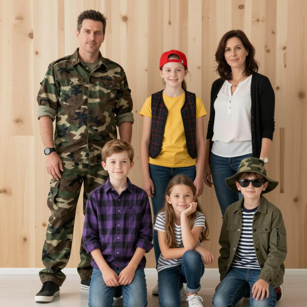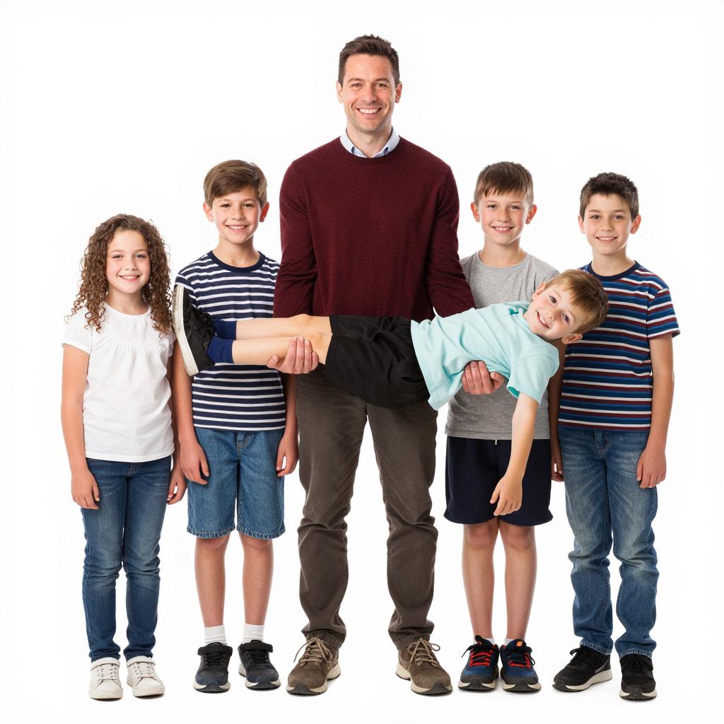 Six people. Man in glasses, black shirt, top center. Woman with long dark hair, red shirt, smiling, center. Blonde woman with shoulder-length hair, black shirt, right. Young girl with brown hair, white headband, front left. Boy with curly brown hair, blue shirt, center front. Boy with blond hair, orange and yellow shirt, front right. Dark background. People close together, smiling.