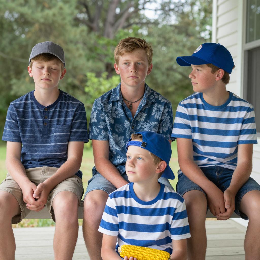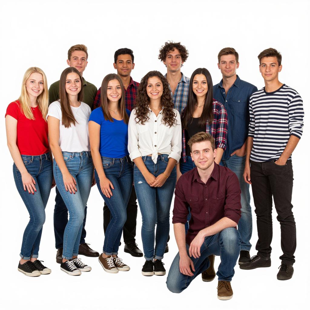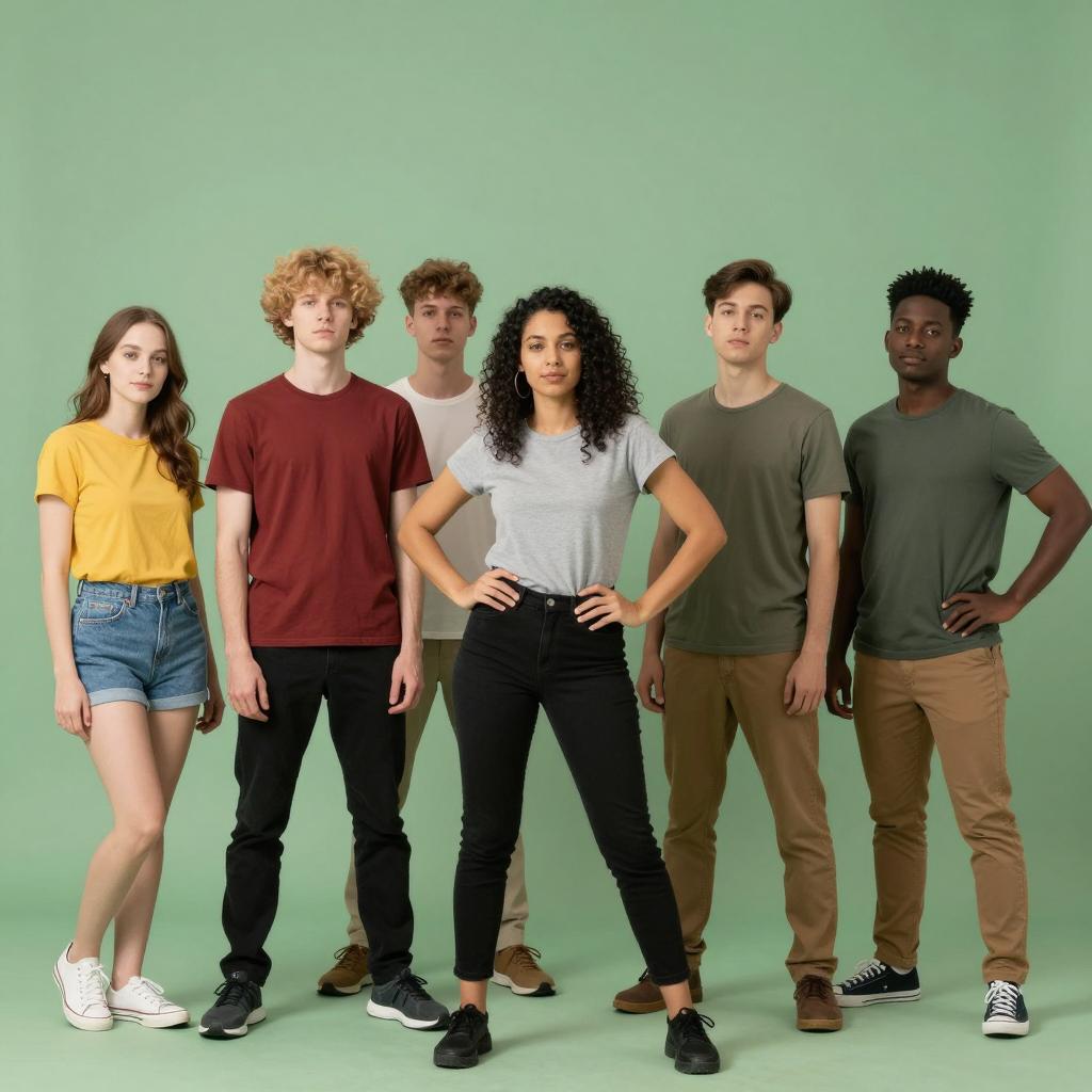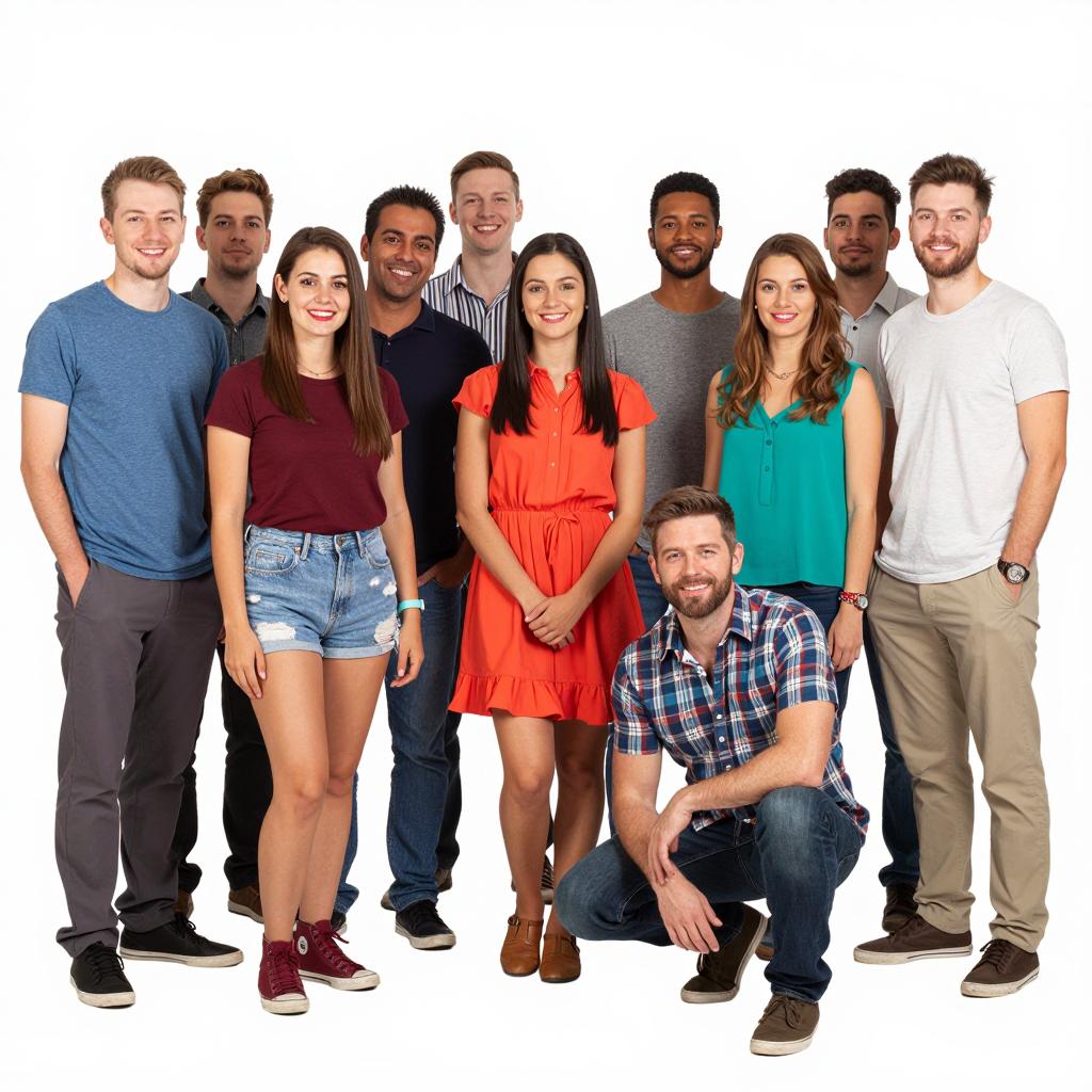 Six people. Man in glasses, black shirt, top center. Woman with long dark hair, red shirt, smiling, center. Blonde woman with shoulder-length hair, black shirt, right. Young girl with brown hair, white headband, front left. Boy with curly brown hair, blue shirt, center front. Boy with blond hair, orange and yellow shirt, front right. Dark background. People close together, smiling.