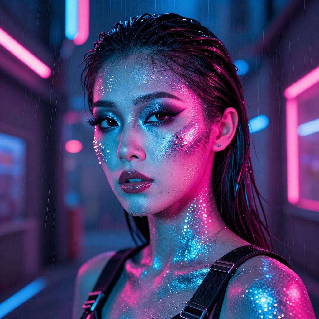 Cyberpunk futuristic makeup with metallic chrome textures and LED embedded patterns on the skin, vibrant colors of electric blue and hot pink, model in a neon-lit alley with cyber gadgets and digital rain, cinematic atmosphere