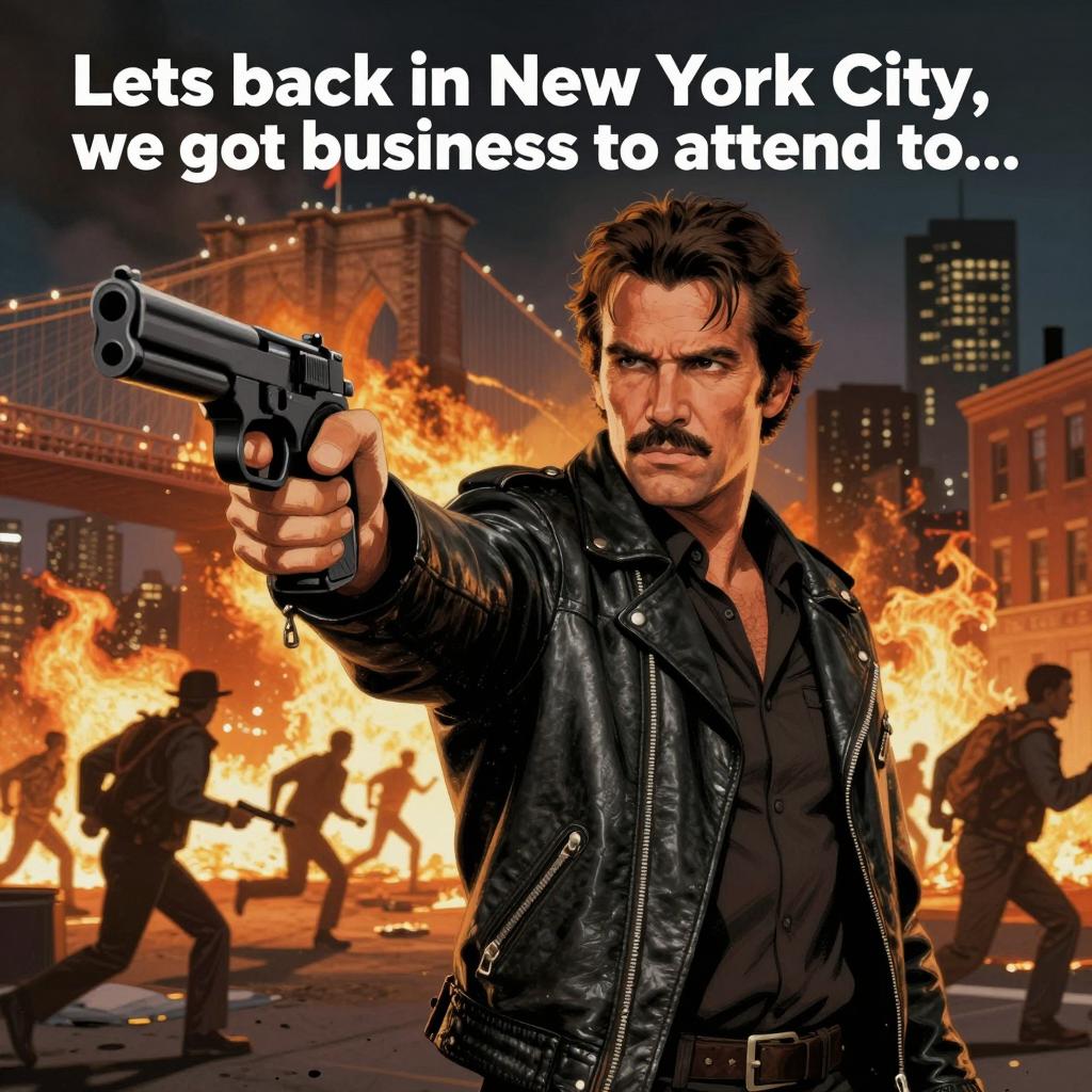 Illustration of Charlie Bronson pointing a gun forward. He has dark hair, a mustache, and wears a black leather jacket. Background shows a burning cityscape with the Brooklyn Bridge, buildings, and people running and fighting. Text reads "Let's back in New York City, we got business to attend to...". Intense facial expression, realistic style. Multiple people in the background, some with guns, others fleeing. Bright fire contrasts with dark night sky.