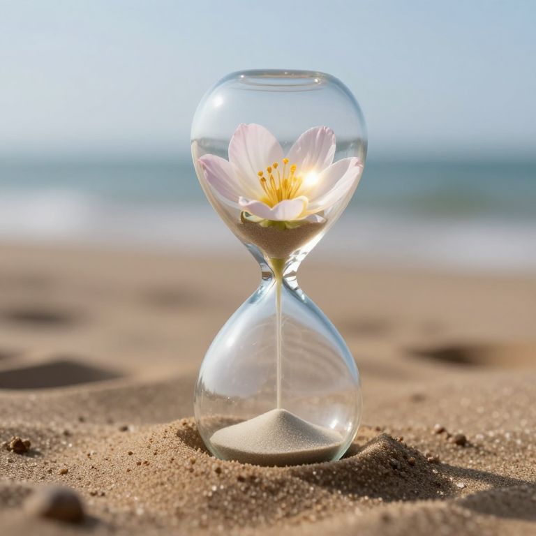 A delicate flower blooms defiantly from the sands of an hourglass, its petals glowing with ethereal light as time flows backward, defying the passage of moments.