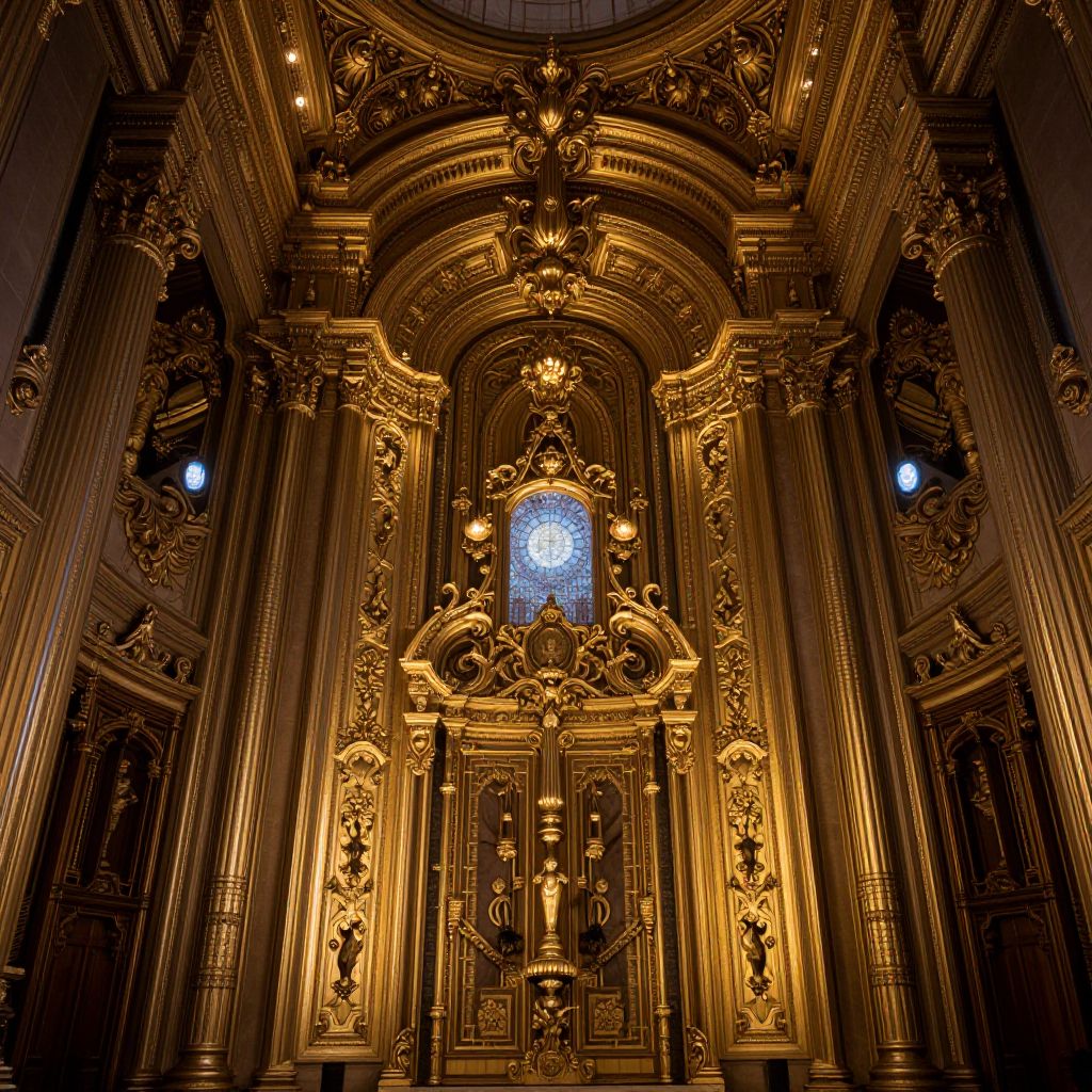 Grand, ornate, neoclassical interior with towering columns, large circular skylight, and intricate gold detailing. Sunlight streams through central