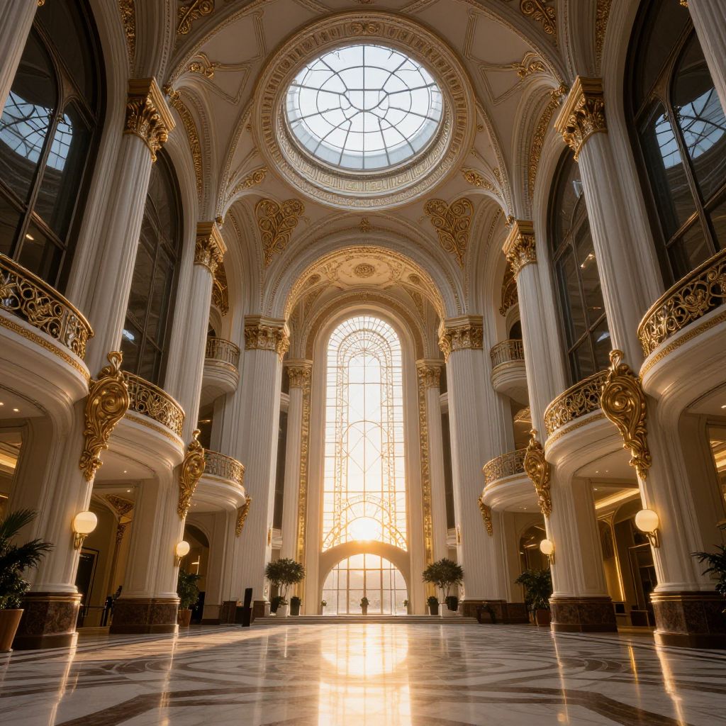 Photograph of a grand, opulent atrium with high, ornate ceilings and large, arched windows allowing bright sunlight to stream in. The space features towering Corinthian columns, intricate gold-accented arches, and a large circular skylight at the center. The floor has a polished, black-and-white marble pattern. Ornate balconies with gold railings line the upper levels, and spherical white lamps are mounted on the walls. Potted plants are placed symmetrically at the base of the columns, adding greenery to the luxurious setting. The overall style is classical and baroque.