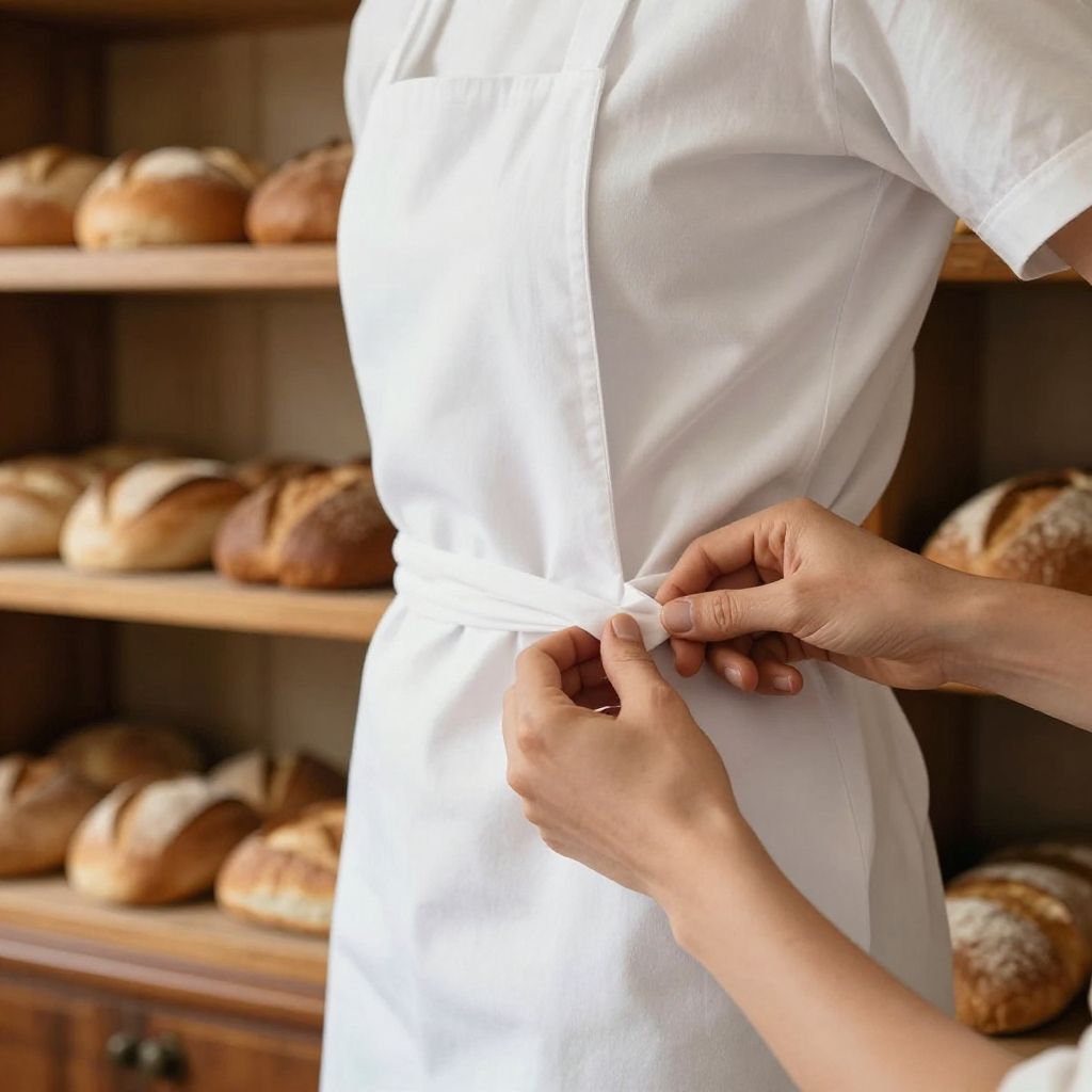 Close-up of hands tying a delantal blanco around the waist in a vintage bakery, warm tones, wooden shelves with fresh bread, morning light flooding in
