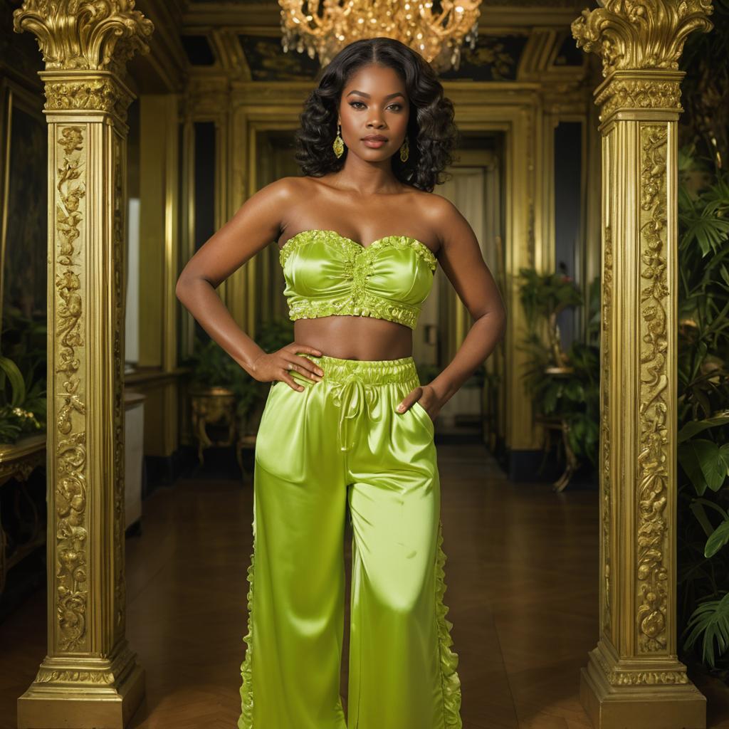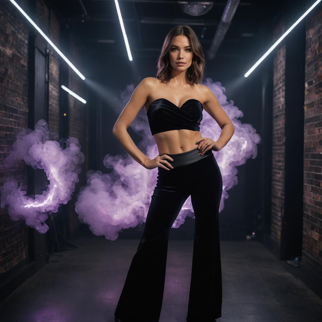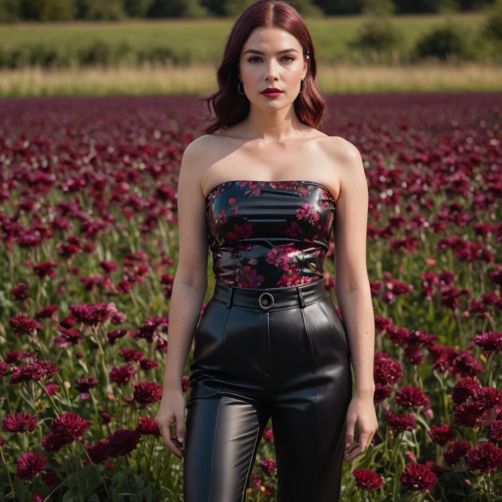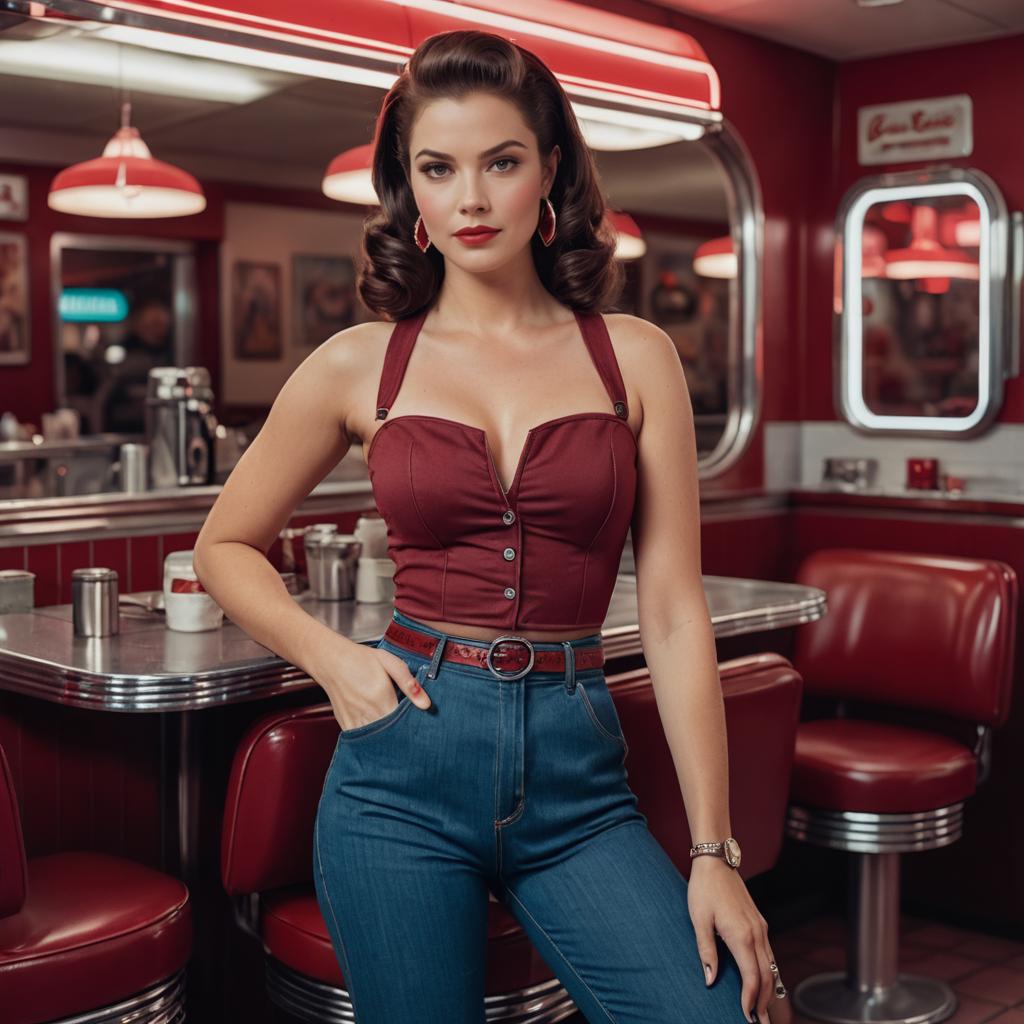 Mini Tube top, full-body studio fashion photograph showcasing a beautiful woman. The woman wears a fitted denim tube top paired with high-waisted tailored trousers in deep burgundy. She stands in a retro American diner booth with red vinyl seats. Casual style, photorealistic, bursting breasts, large breasts