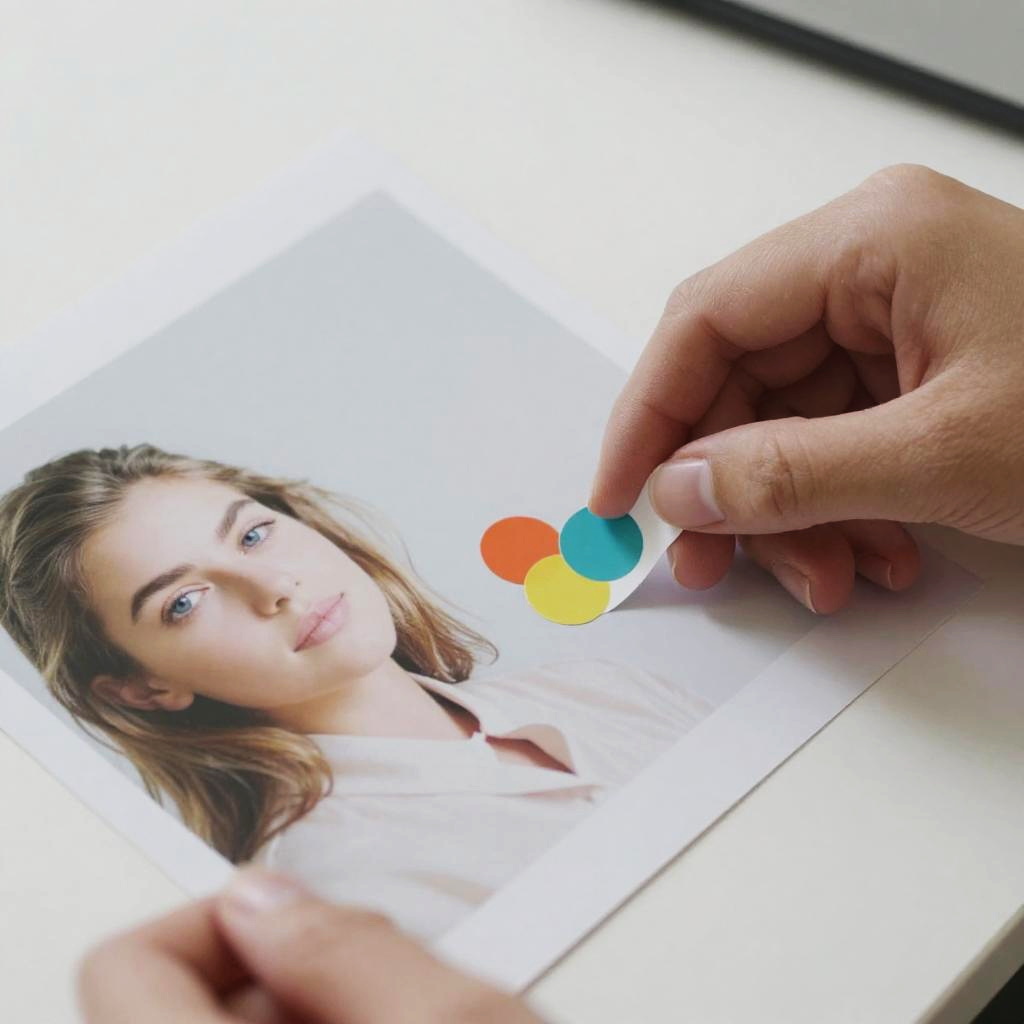 Can you remove stickers from photos with a delicate touch? Create an image showing a photo being gently cleaned of colorful stickers, revealing the pristine surface underneath, with soft natural lighting and a calm atmosphere.